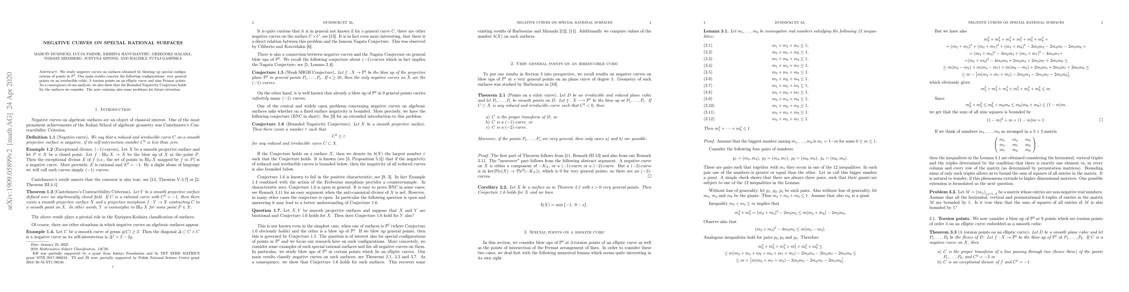 This paper investigates negative curves on special rational surfaces formed by blowing up configurations of points, including very general points on a cubic, 3-torsion points on an elliptic curve, and nine Fermat points. It demonstrates that the Bounded Negativity Conjecture holds for these surfaces.