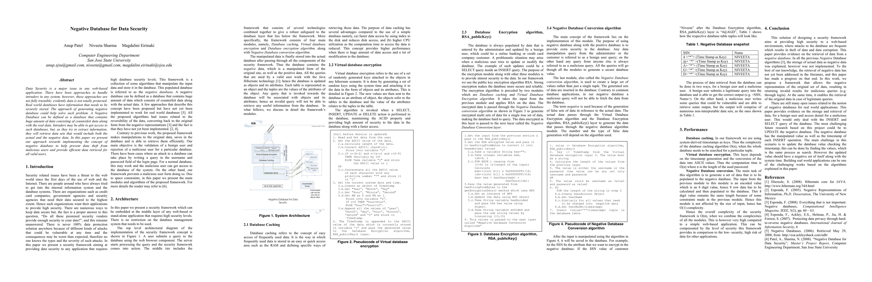 Data Security is a major issue in any web-based application. There have been approaches to handle intruders in any system, however, these approaches are not fully trustable; evidently data is not totally protected. Real world databases have information that needs to be securely stored. The approach of generating negative database could help solve such problem. A Negative Database can be defined as a database that contains huge amount of data consisting of counterfeit data along with the real data. Intruders may be able to get access to such databases, but, as they try to extract information, they will retrieve data sets that would include both the actual and the negative data. In this paper we present our approach towards implementing the concept of negative database to help prevent data theft from malicious users and provide efficient data retrieval for all valid users.