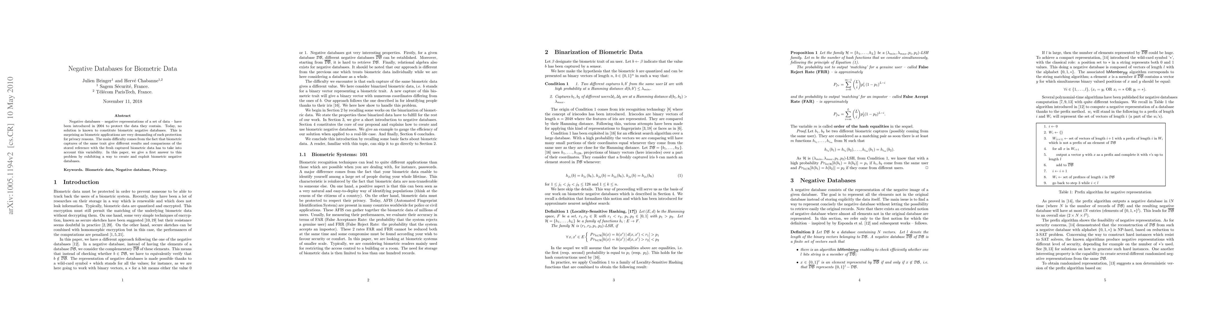Negative databases - negative representations of a set of data - have been introduced in 2004 to protect the data they contain. Today, no solution is known to constitute biometric negative databases. This is surprising as biometric applications are very demanding of such protection for privacy reasons. The main difficulty comes from the fact that biometric captures of the same trait give different results and comparisons of the stored reference with the fresh captured biometric data has to take into account this variability. In this paper, we give a first answer to this problem by exhibiting a way to create and exploit biometric negative databases.