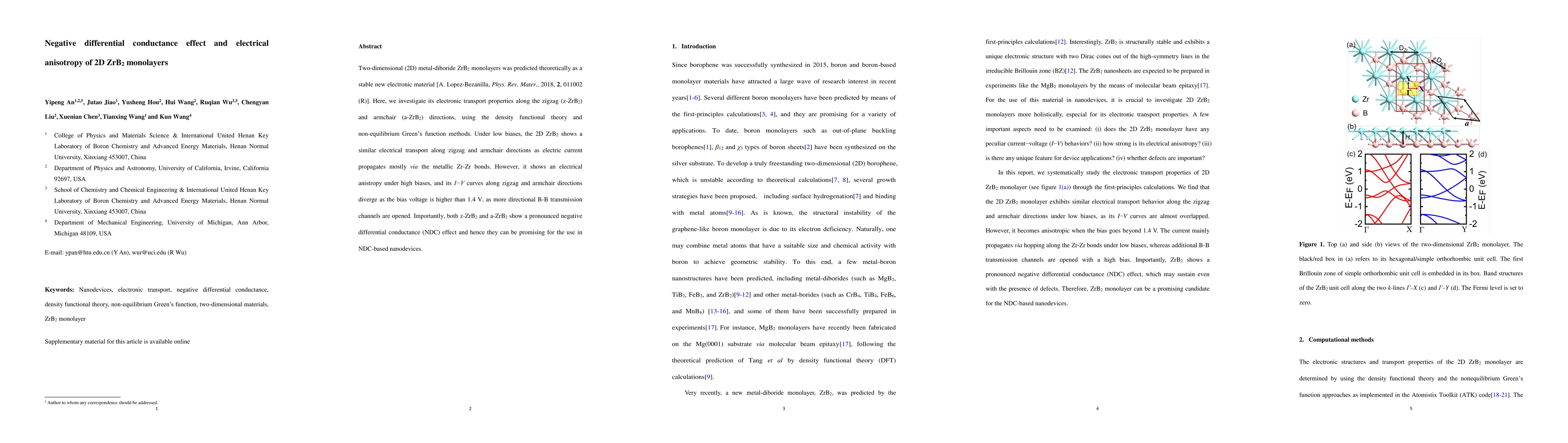 Two-dimensional (2D) metal-diboride ZrB2 monolayers was predicted theoretically as a stable new electronic material [A. Lopez-Bezanilla, Phys. Rev. Mater., 2018, 2, 011002 (R)]. Here, we investigate its electronic transport properties along the zigzag (z-ZrB2) and armchair (a-ZrB2) directions, using the density functional theory and non-equilibrium Green's function methods. Under low biases, the 2D ZrB2 shows a similar electrical transport along zigzag and armchair directions as electric current propagates mostly via the metallic Zr-Zr bonds. However, it shows an electrical anistropy under high biases, and its I-V curves along zigzag and armchair directions diverge as the bias voltage is higher than 1.4 V, as more directional B-B transmission channels are opened. Importantly, both z-ZrB2 and a-ZrB2 show a pronounced negative differential conductance (NDC) effect and hence they can be promising for the use in NDC-based nanodevices.