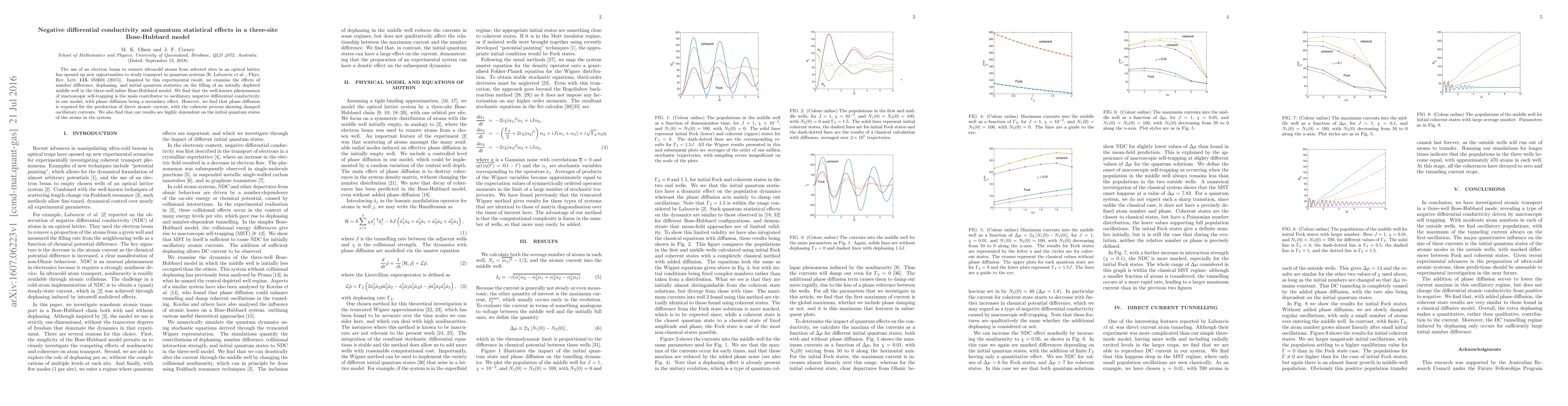 This paper explores the negative differential conductivity in a three-site Bose-Hubbard model, attributing it mainly to macroscopic self-trapping and secondarily to phase diffusion. The study highlights the significant influence of initial quantum statistics on the transport properties.