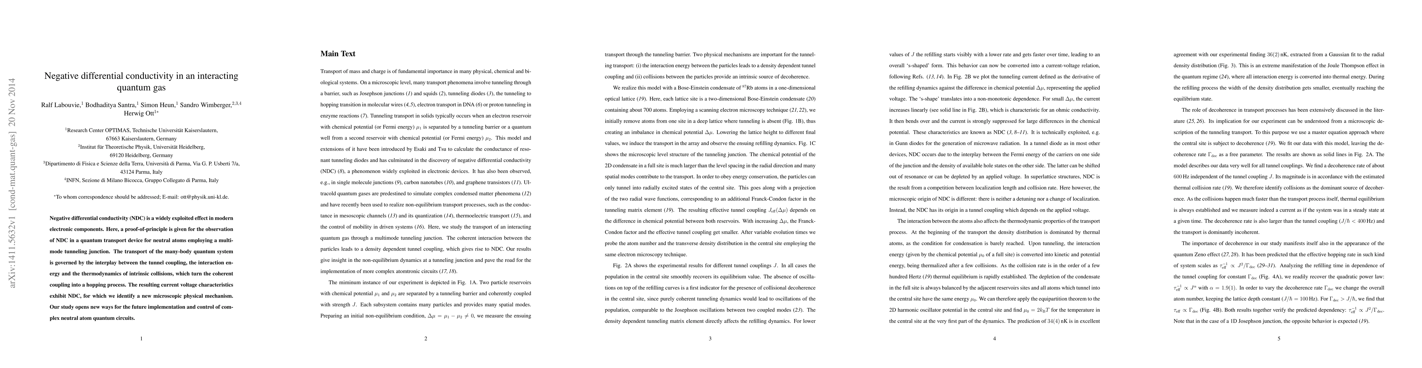 Negative differential conductivity (NDC) is a widely exploited effect in modern electronic components. Here, a proof-of-principle is given for the observation of NDC in a quantum transport device for neutral atoms employing a multi-mode tunneling junction. The transport of the many-body quantum system is governed by the interplay between the tunnel coupling, the interaction energy and the thermodynamics of intrinsic collisions, which turn the coherent coupling into a hopping process. The resulting current voltage characteristics exhibit NDC, for which we identify a new microscopic physical mechanism. Our study opens new ways for the future implementation and control of complex neutral atom quantum circuits.