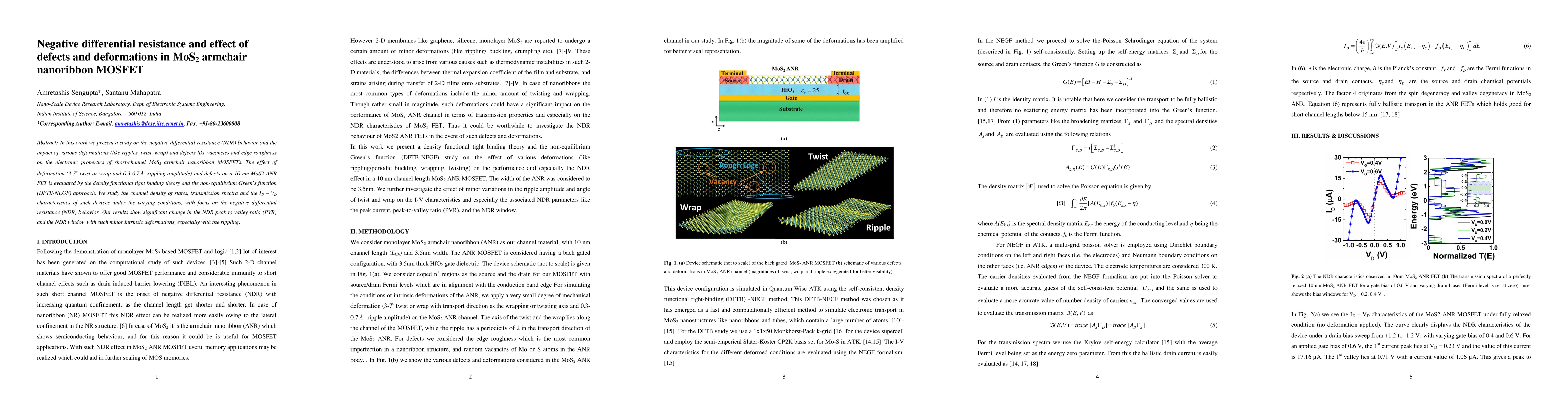 This paper investigates how negative differential resistance (NDR) in MoS2 armchair nanoribbon MOSFETs is influenced by deformations (ripples, twist, wrap) and defects (vacancies, edge roughness) using density functional tight binding theory and non-equilibrium Green’s function approach. The study finds that minor deformations notably alter the NDR peak to valley ratio and window, particularly due to rippling.