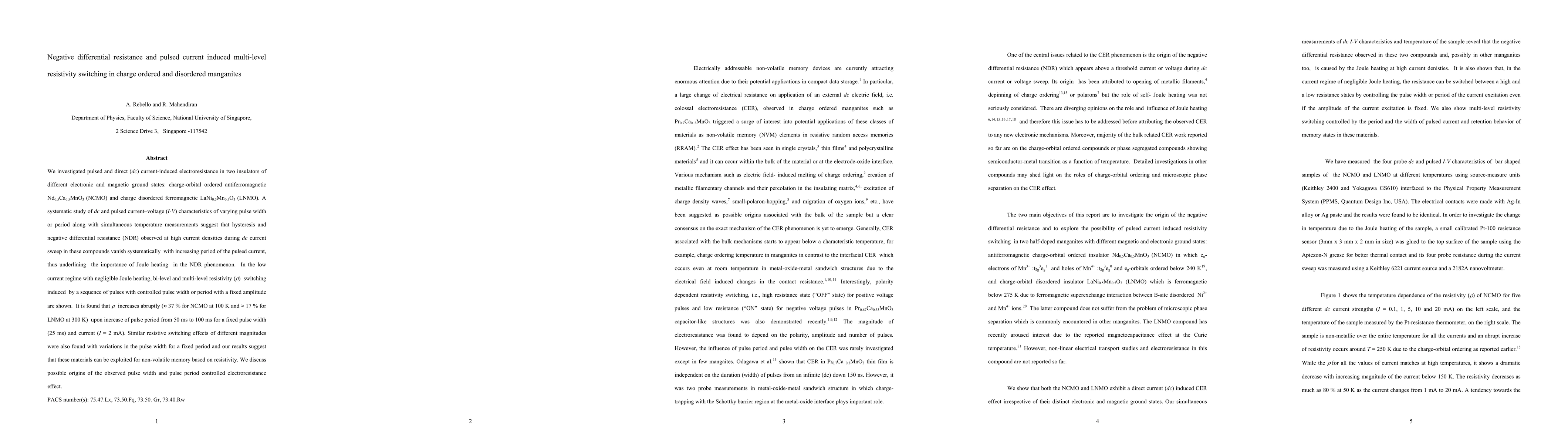 This research investigates electroresistance in two manganites under direct and pulsed current, showing negative differential resistance linked to Joule heating at high current densities. Pulsed current at lower densities induces multi-level resistivity switching, suggesting mechanisms beyond simple Joule heating.