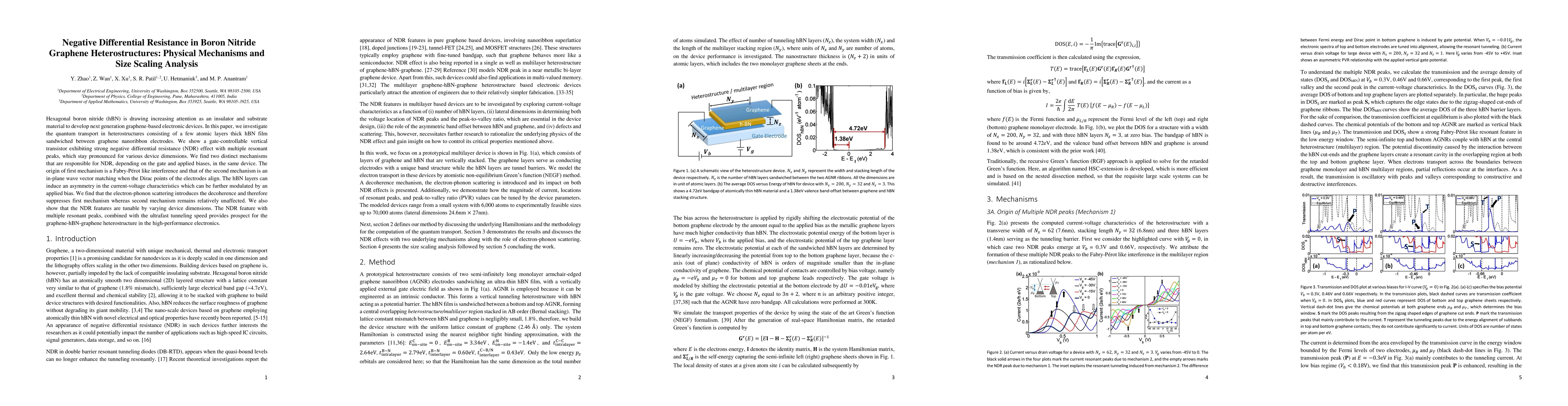 Hexagonal boron nitride (hBN) is drawing increasing attention as an insulator and substrate material to develop next generation graphene-based electronic devices. In this paper, we investigate the quantum transport in heterostructures consisting of a few atomic layers thick hBN film sandwiched between graphene nanoribbon electrodes. We show a gate-controllable vertical transistor exhibiting strong negative differential resistance (NDR) effect with multiple resonant peaks, which stay pronounced for various device dimensions. We find two distinct mechanisms that are responsible for NDR, depending on the gate and applied biases, in the same device. The origin of first mechanism is a Fabry-P\'e like interference and that of the second mechanism is an in-plane wave vector matching when the Dirac points of the electrodes align. The hBN layers can induce an asymmetry in the current-voltage characteristics which can be further modulated by an applied bias. We find that the electron-phonon scattering introduces the decoherence and therefore suppresses first mechanism whereas second mechanism remains relatively unaffected. We also show that the NDR features are tunable by varying device dimensions. The NDR feature with multiple resonant peaks, combined with the ultrafast tunneling speed provides prospect for the graphene-hBN-graphene heterostructure in the high-performance electronics.