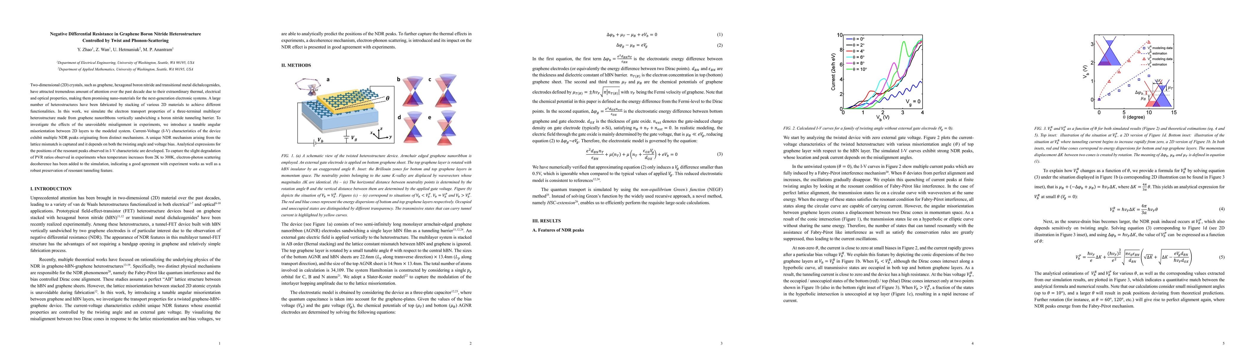 Two-dimensional (2D) crystals, such as graphene, hexagonal boron nitride and transitional metal dichalcogenides, have attracted tremendous amount of attention over the past decade due to their extraordinary thermal, electrical and optical properties, making them promising nano-materials for the next-generation electronic systems. A large number of heterostructures have been fabricated by stacking of various 2D materials to achieve different functionalities. In this work, we simulate the electron transport properties of a three-terminal multilayer heterostructure made from graphene nanoribbons vertically sandwiching a boron nitride tunneling barrier. To investigate the effects of the unavoidable misalignment in experiments, we introduce a tunable angular misorientation between 2D layers to the modeled system. Current-Voltage (I-V) characteristics of the device exhibit multiple NDR peaks originating from distinct mechanisms. A unique NDR mechanism arising from the lattice mismatch is captured and it depends on both the twisting angle and voltage bias. Analytical expressions for the positions of the resonant peaks observed in I-V characteristic are developed. To capture the slight degradation of PVR ratios observed in experiments when temperature increases from 2K to 300K, electron-photon scattering decoherence has been added to the simulation, indicating a good agreement with experiment works as well as a robust preservation of resonant tunneling feature.