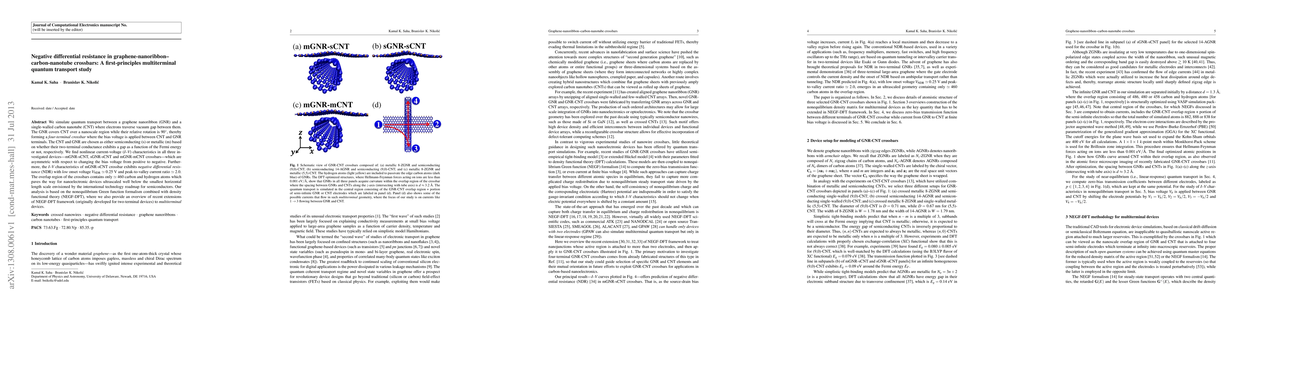 We simulate quantum transport between a graphene nanoribbon (GNR) and a single-walled carbon nanotube (CNT) where electrons traverse vacuum gap between them. The GNR covers CNT over a nanoscale region while their relative rotation is 90 degrees, thereby forming a four-terminal crossbar where the bias voltage is applied between CNT and GNR terminals. The CNT and GNR are chosen as either semiconducting (s) or metallic (m) based on whether their two-terminal conductance exhibits a gap as a function of the Fermi energy or not, respectively. We find nonlinear current-voltage (I-V) characteristics in all three investigated devices---mGNR-sCNT, sGNR-sCNT and mGNR-mCNT crossbars---which are asymmetric with respect to changing the bias voltage from positive to negative. Furthermore, the I-V characteristics of mGNR-sCNT crossbar exhibits negative differential resistance (NDR) with low onset voltage $V_\mathrm{NDR} \simeq 0.25$ V and peak-to-valley current ratio $\simeq 2.0$. The overlap region of the crossbars contains only $\simeq 460$ carbon and hydrogen atoms which paves the way for nanoelectronic devices ultrascaled well below the smallest horizontal length scale envisioned by the international technology roadmap for semiconductors. Our analysis is based on the nonequilibrium Green function formalism combined with density functional theory (NEGF-DFT), where we also provide an overview of recent extensions of NEGF-DFT framework (originally developed for two-terminal devices) to multiterminal devices.