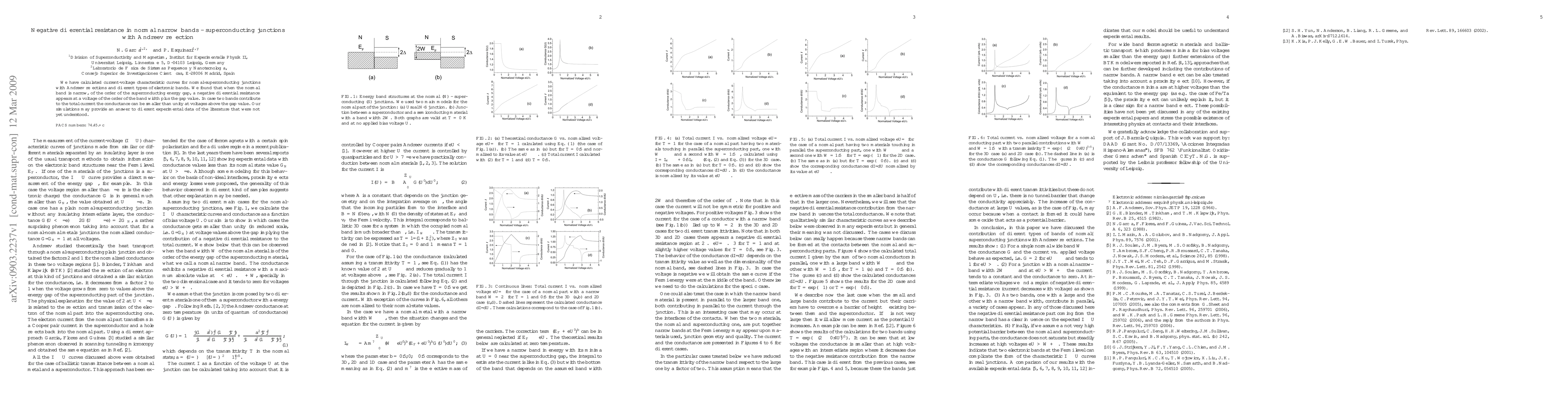 The paper presents calculations of current-voltage characteristics in narrow-band normal-superconducting junctions with Andreev reflections, revealing negative differential resistance at voltages near band width plus gap. With multiple contributing bands, conductance can fall below unity above the gap, potentially explaining certain experimental findings.
