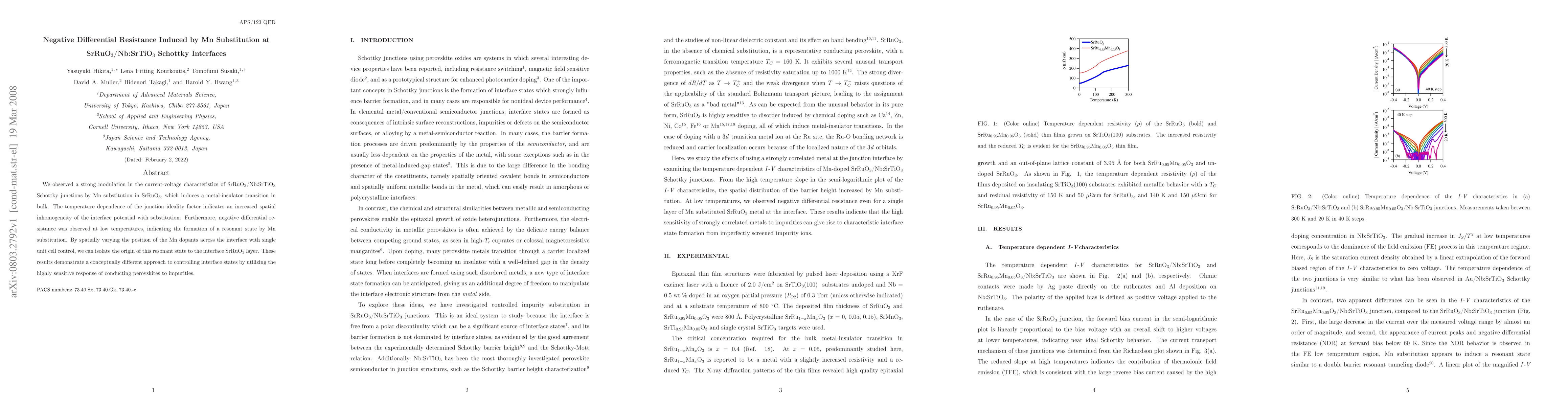 This paper investigates the impact of Mn substitution in SrRuO$_3$ on SrRuO$_3$/Nb:SrTiO$_3$ Schottky junctions, revealing negative differential resistance and a metal-insulator transition, attributed to increased spatial inhomogeneity at the interface. The study highlights a novel method for controlling interface states via impurity-induced resonant states.
