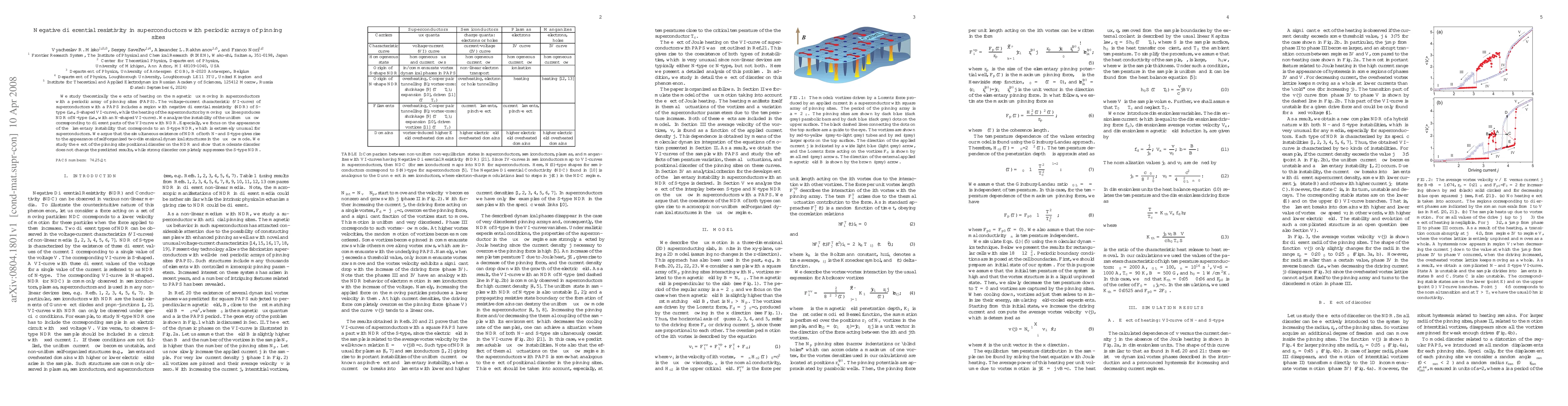 This paper theoretically investigates the voltage-current characteristics of superconductors with periodic pinning arrays, revealing the presence of both S-type and N-type negative differential resistivity due to heating and flux motion. The study highlights the unusual filamentary instability associated with S-type NDR and its suppression by strong positional disorder.