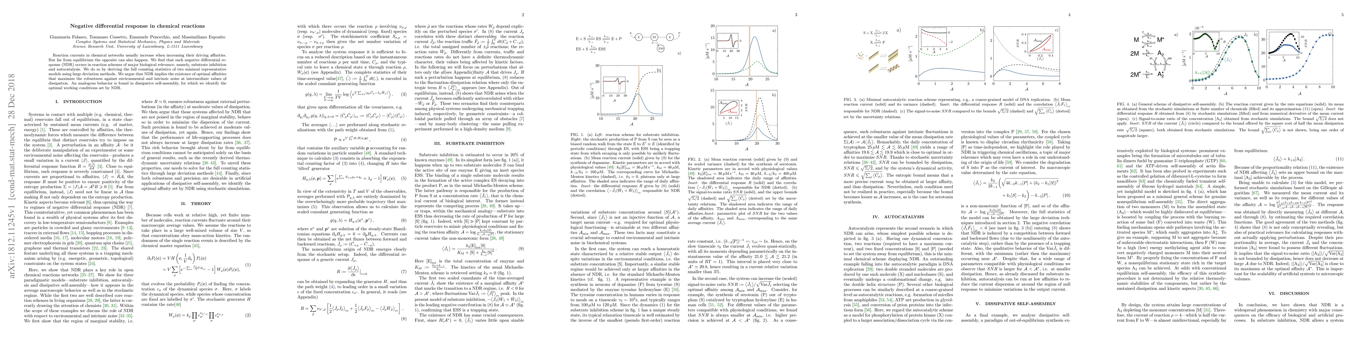 Reaction currents in chemical networks usually increase when increasing their driving affinities. But far from equilibrium the opposite can also happen. We find that such negative differential response (NDR) occurs in reaction schemes of major biological relevance, namely, substrate inhibition and autocatalysis. We do so by deriving the full counting statistics of two minimal representative models using large deviation methods. We argue that NDR implies the existence of optimal affinities that maximize the robustness against environmental and intrinsic noise at intermediate values of dissipation. An analogous behavior is found in dissipative self-assembly, for which we identify the optimal working conditions set by NDR.