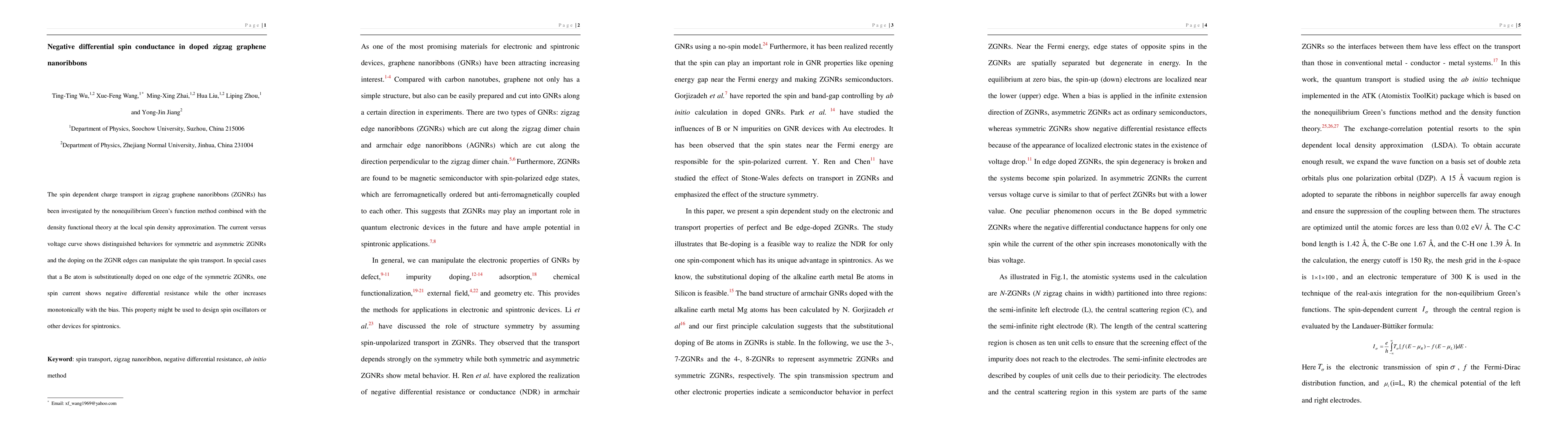 This paper investigates spin-dependent charge transport in zigzag graphene nanoribbons using nonequilibrium Green's function and density functional theory, revealing distinct behaviors in symmetric and asymmetric ZGNRs. The study shows that doping on the edges can manipulate spin transport, with a Be atom substitutionally doped on one edge of symmetric ZGNRs resulting in negative differential spin conductance, potentially useful for spintronics devices.