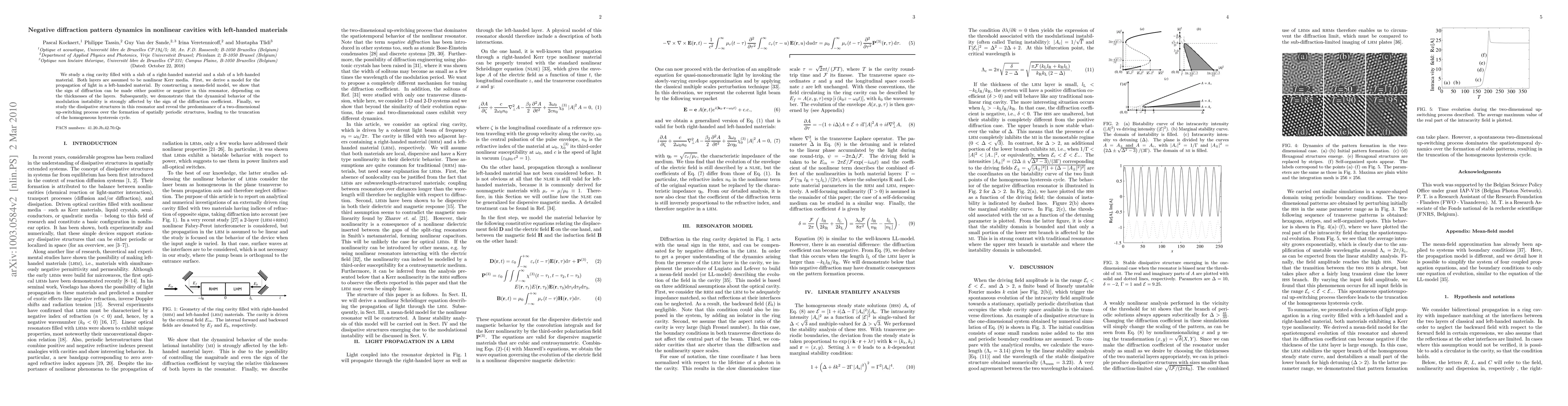We study a ring cavity filled with a slab of a right-handed material and a slab of a left-handed material. Both layers are assumed to be nonlinear Kerr media. First, we derive a model for the propagation of light in a left-handed material. By constructing a mean-field model, we show that the sign of diffraction can be made either positive or negative in this resonator, depending on the thicknesses of the layers. Subsequently, we demonstrate that the dynamical behavior of the modulation instability is strongly affected by the sign of the diffraction coefficient. Finally, we study the dissipative structures in this resonator and reveal the predominance of a two-dimensional up-switching process over the formation of spatially periodic structures, leading to the truncation of the homogeneous hysteresis cycle.