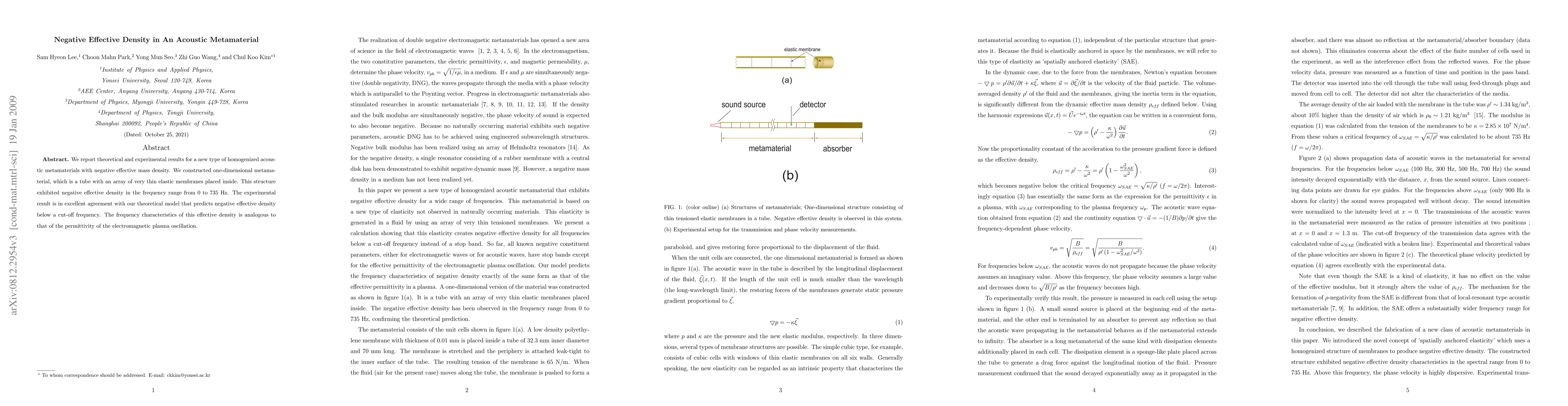 This paper presents theoretical and experimental validation of a one-dimensional acoustic metamaterial with negative effective mass density, achieved through a tube with thin elastic membranes. The structure shows negative density below 735 Hz, with experimental results matching the theoretical model.