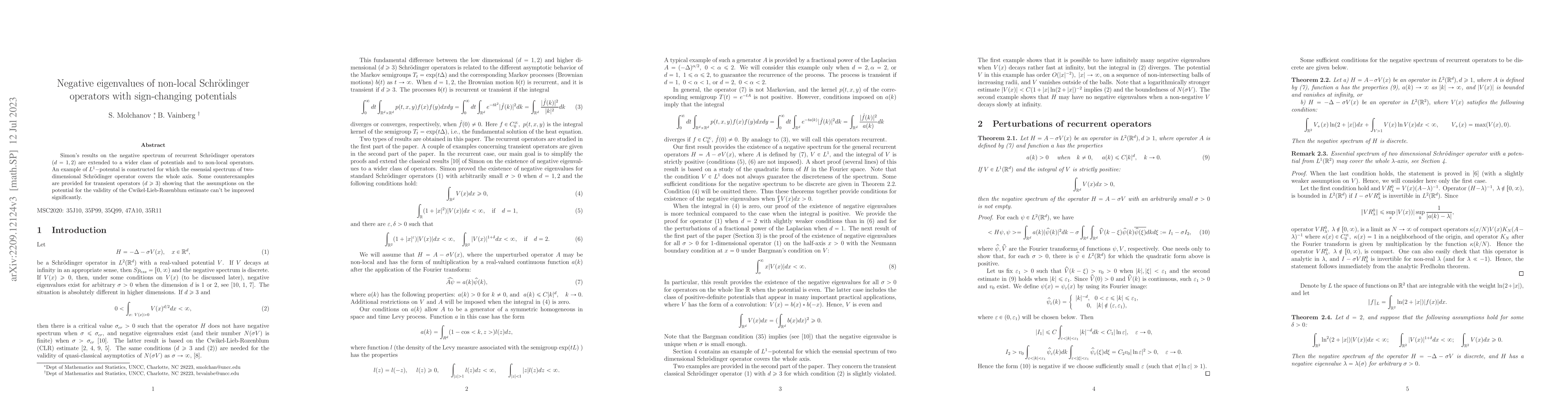 This paper extends Simon's findings on negative eigenvalues of recurrent Schrödinger operators to non-local operators with sign-changing potentials, constructing an $L^1$-potential example for a two-dimensional operator with an essential spectrum covering the entire axis. It also presents counterexamples for transient operators in higher dimensions, indicating limitations in improving assumptions for the Cwikel-Lieb-Rozenblum estimate.