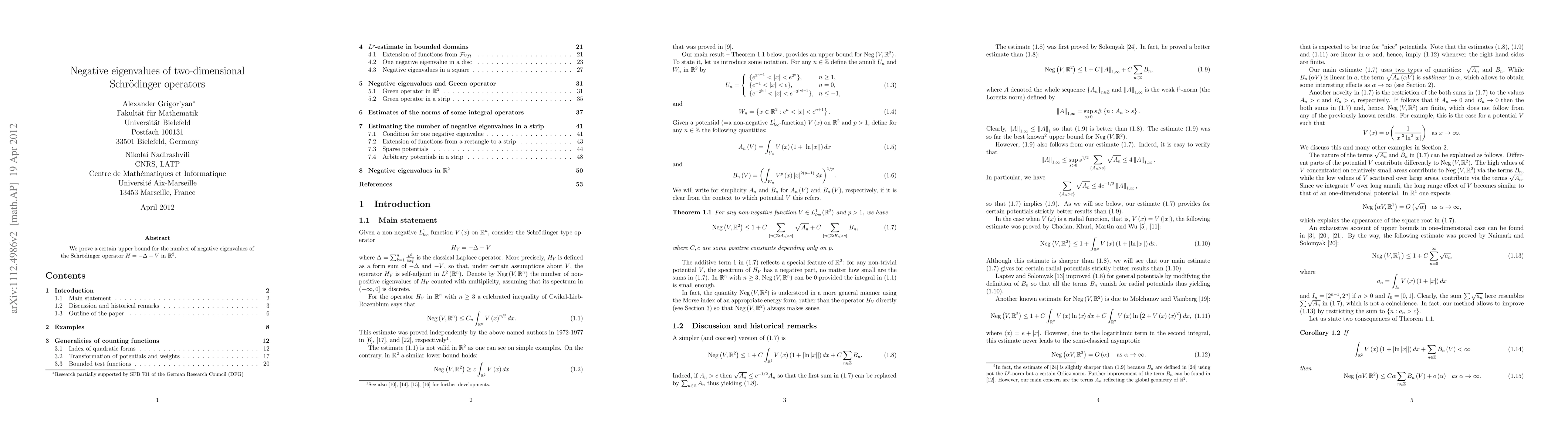 Summary: This paper establishes an upper bound for the count of negative eigenvalues in two-dimensional Schrödinger operators on the plane, contributing to the understanding of spectral properties.