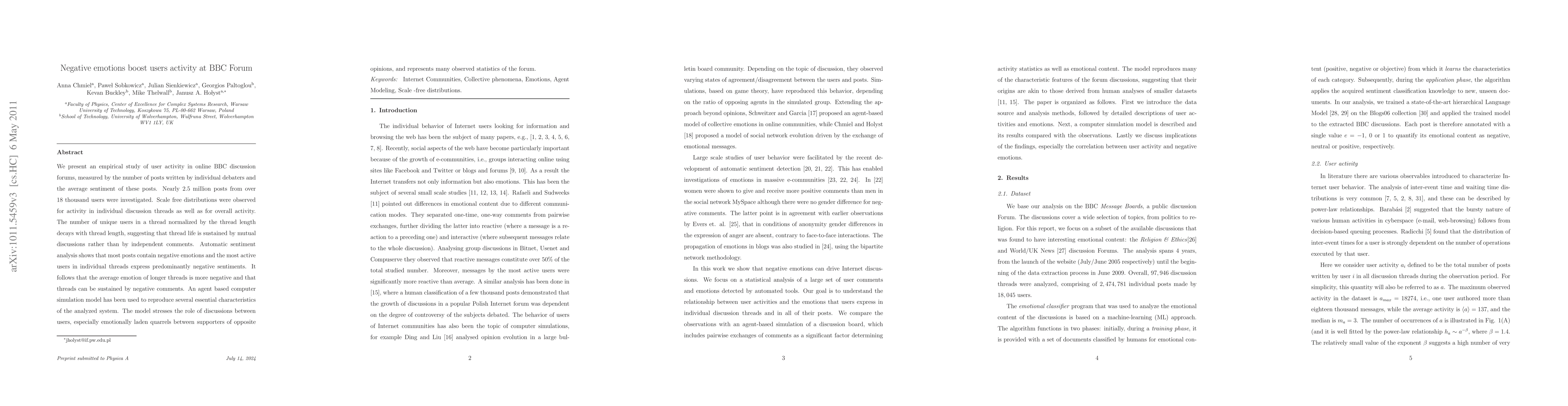 This study investigates user activity on BBC discussion forums, revealing that negative emotions significantly boost user engagement. The analysis of nearly 2.5 million posts from over 18,000 users shows that negative sentiments are prevalent among the most active participants, suggesting that emotionally charged discussions sustain forum activity. For more details, refer to the original research paper.