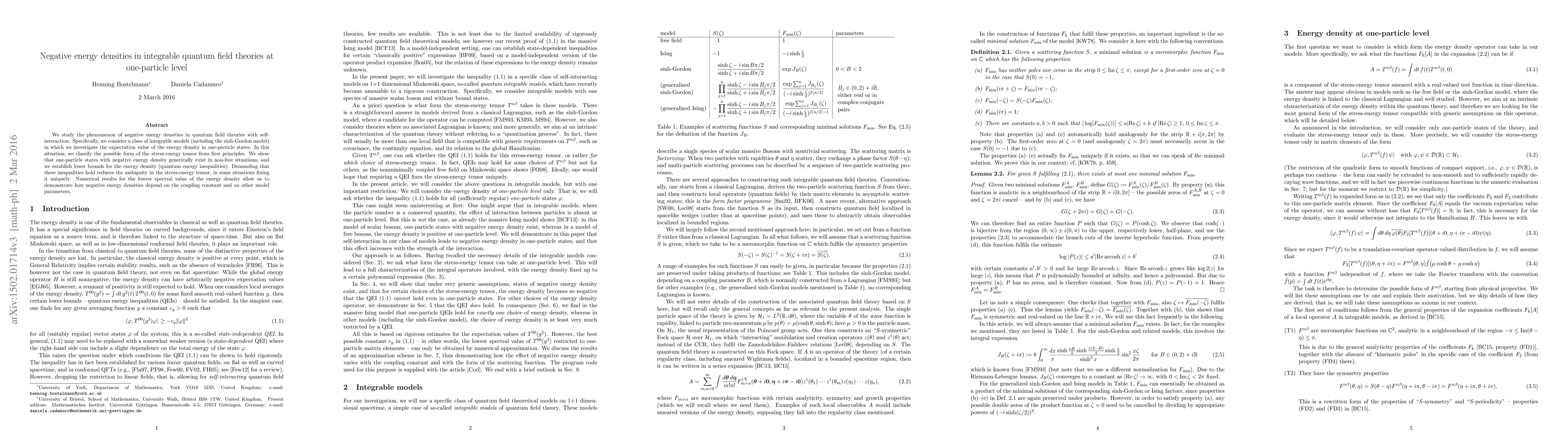 This paper investigates negative energy densities in integrable quantum field theories, particularly focusing on one-particle states in self-interacting systems like the sinh-Gordon model. It establishes quantum energy inequalities that constrain the stress-energy tensor, often fixing it uniquely, and demonstrates the dependence of negative energy densities on coupling constants and model parameters through numerical results.