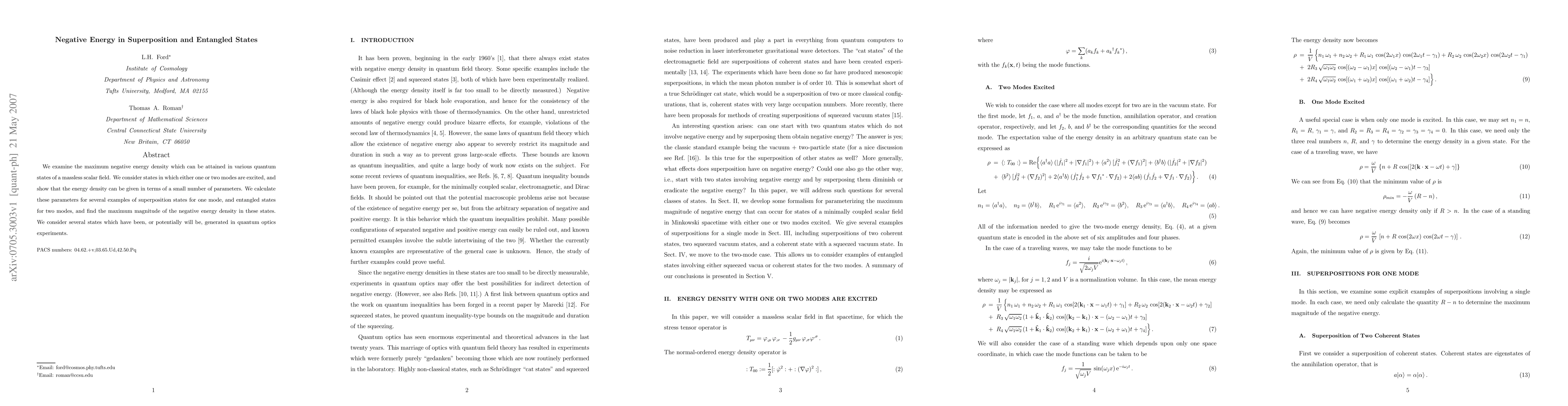 This paper investigates the maximum negative energy density achievable in superposition and entangled states of a massless scalar field, determining the parameters that define this density and calculating them for various quantum optics states. The study finds the highest magnitude of negative energy density in these quantum states.