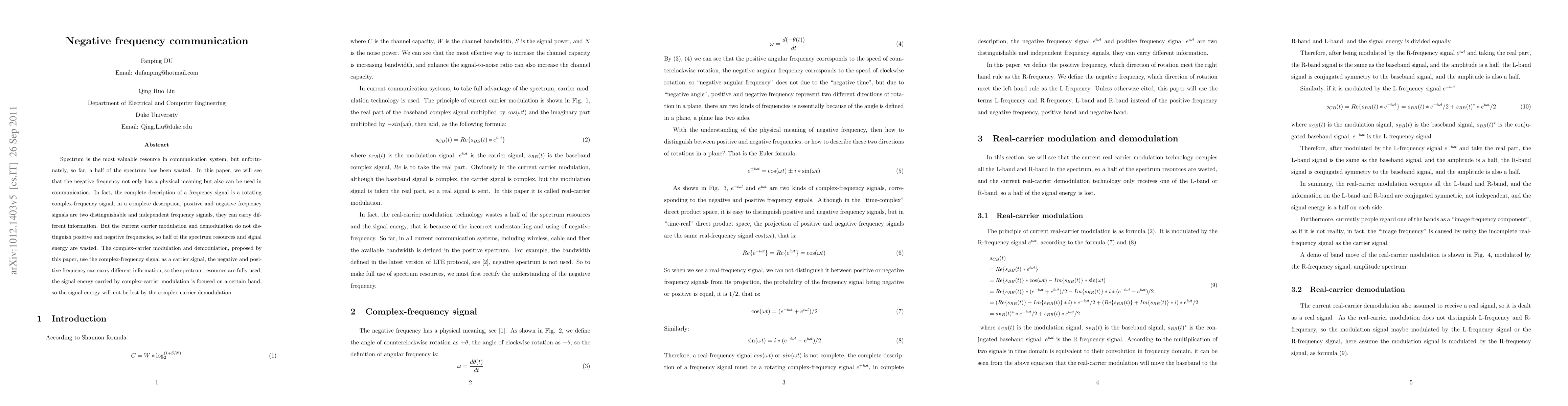 Spectrum is the most valuable resource in communication system, but unfortunately, so far, a half of the spectrum has been wasted. In this paper, we will see that the negative frequency not only has a physical meaning but also can be used in communication. In fact, the complete description of a frequency signal is a rotating complex-frequency signal, in a complete description, positive and negative frequency signals are two distinguishable and independent frequency signals, they can carry different information. But the current carrier modulation and demodulation do not distinguish positive and negative frequencies, so half of the spectrum resources and signal energy are wasted. The complex-carrier modulation and demodulation, proposed by this paper, use the complex-frequency signal as a carrier signal, the negative and positive frequency can carry different information, so the spectrum resources are fully used, the signal energy carried by complex-carrier modulation is focused on a certain band, so the signal energy will not be lost by the complex-carrier demodulation.