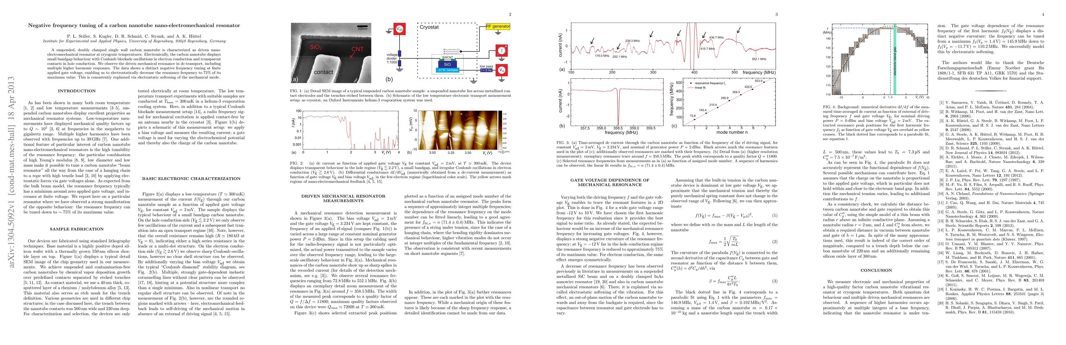 The research investigates a doubly clamped carbon nanotube resonator, demonstrating negative frequency tuning via electrostatic softening, which reduces the resonance frequency by 25% at finite gate voltages. This tuning is achieved at cryogenic temperatures and is corroborated by the observed Coulomb blockade oscillations and transparent hole conduction.