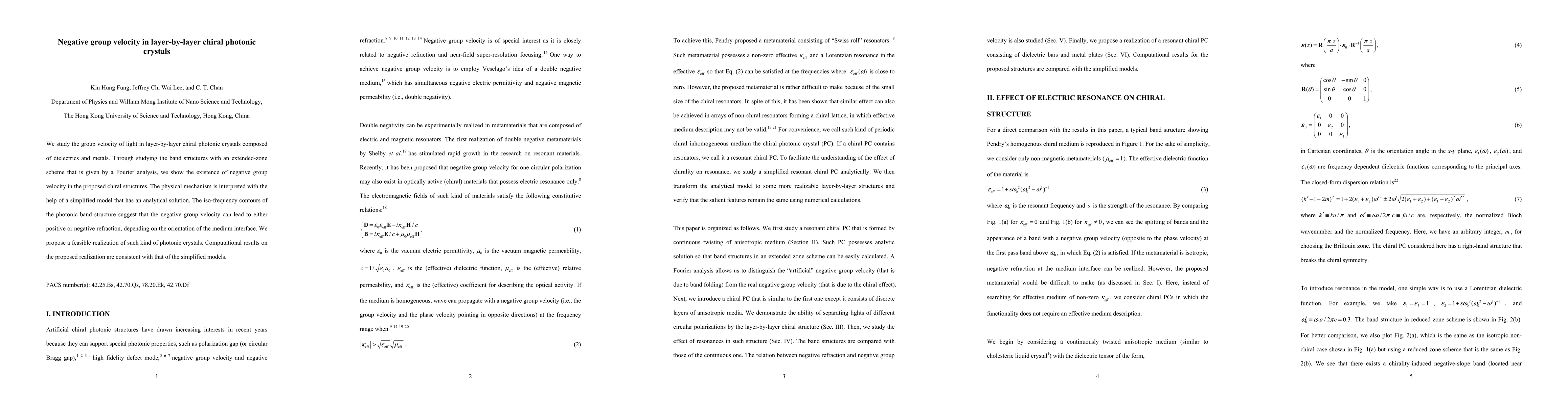 We study the group velocity of light in layer-by-layer chiral photonic crystals composed of dielectrics and metals. Through studying the band structures with an extended-zone scheme that is given by a Fourier analysis, we show the existence of negative group velocity in the proposed chiral structures. The physical mechanism is interpreted with the help of a simplified model that has an analytical solution. The iso-frequency contours of the photonic band structure suggest that the negative group velocity can lead to either positive or negative refraction, depending on the orientation of the medium interface. We propose a feasible realization of such kind of photonic crystals. Computational results on the proposed realization are consistent with that of the simplified models.