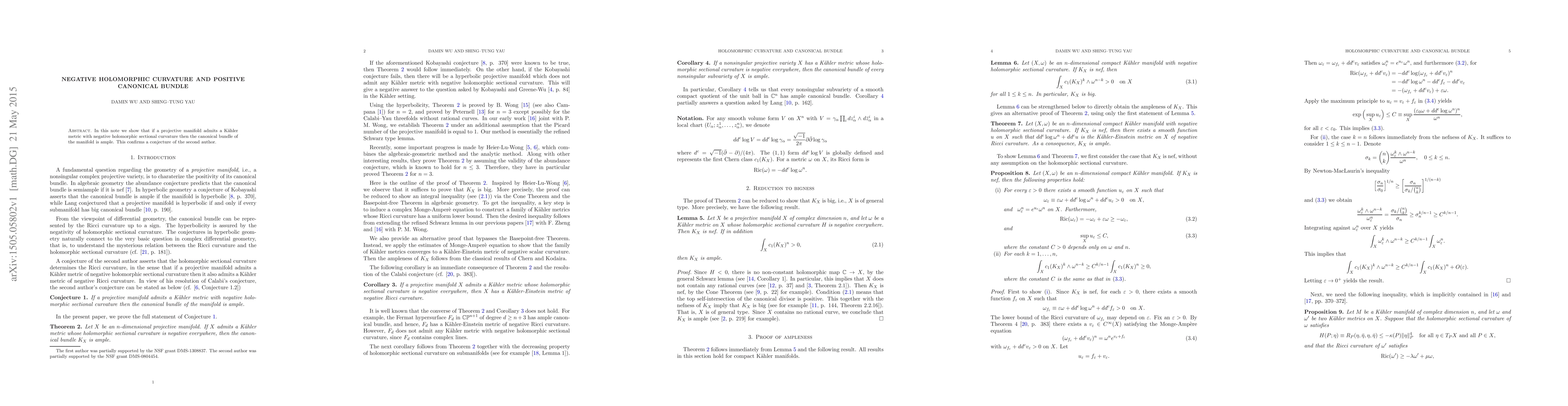 A projective manifold with negative holomorphic sectional curvature has an ample canonical bundle, confirming a conjecture about the relationship between curvature and canonical geometry.