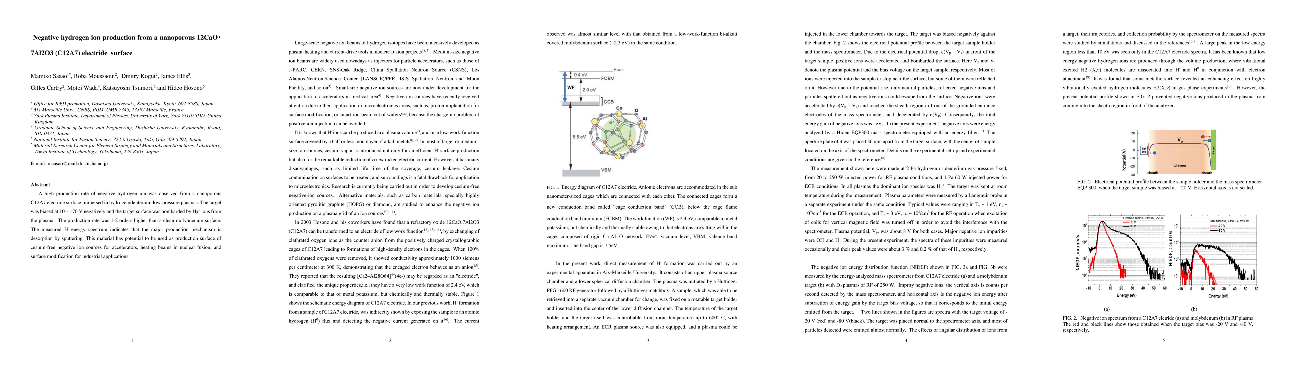A nanoporous C12A7 electride surface shows a high production rate of negative hydrogen ions in low-pressure hydrogen/deuterium plasmas, primarily due to sputtering, with potential applications in cesium-free negative ion sources for accelerators and fusion heating beams. The production rate exceeds that of a clean molybdenum surface by 1-2 orders of magnitude.