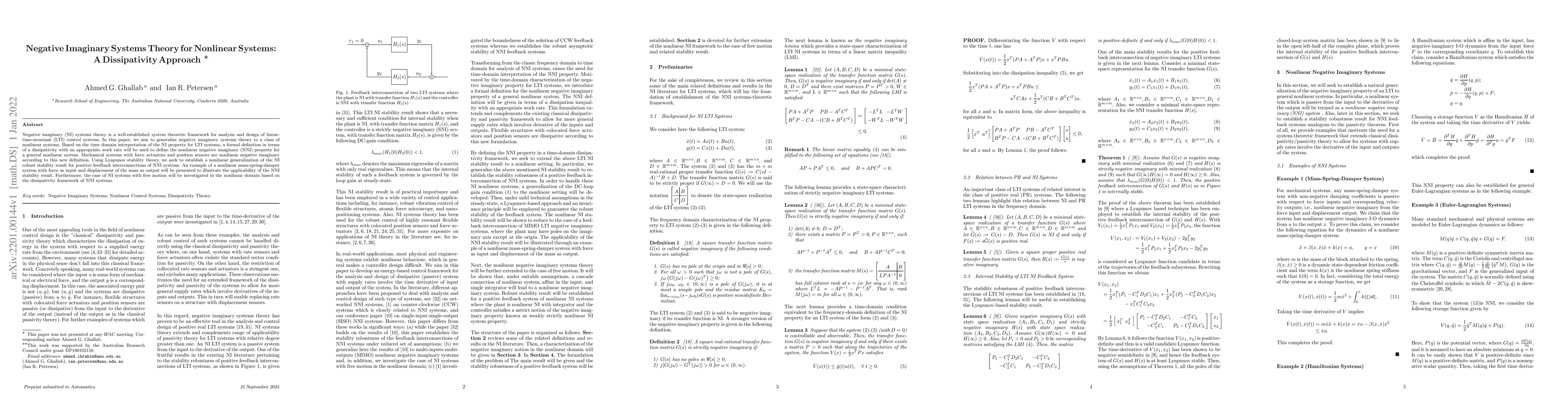 Negative imaginary (NI) systems theory is a well-established system theoretic framework for analysis and design of linear-time-invariant (LTI) control systems. In this paper, we aim to generalize negative imaginary systems theory to a class of nonlinear systems. Based on the time domain interpretation of the NI property for LTI systems, a formal definition in terms of a dissipativity with an appropriate work rate will be used to define the nonlinear negative imaginary (NNI) property for a general nonlinear system. Mechanical systems with force actuators and position sensors are nonlinear negative imaginary according to this new definition. Using Lyapunov stability theory, we seek to establish a nonlinear generalization of the NI robust stability result for positive feedback interconnections of NNI systems. An example of a nonlinear mass-spring-damper system with force as input and displacement of the mass as output will be presented to illustrate the applicability of the NNI stability result. Furthermore, the case of NI systems with free motion will be investigated in the nonlinear domain based on the dissipativity framework of NNI systems.
