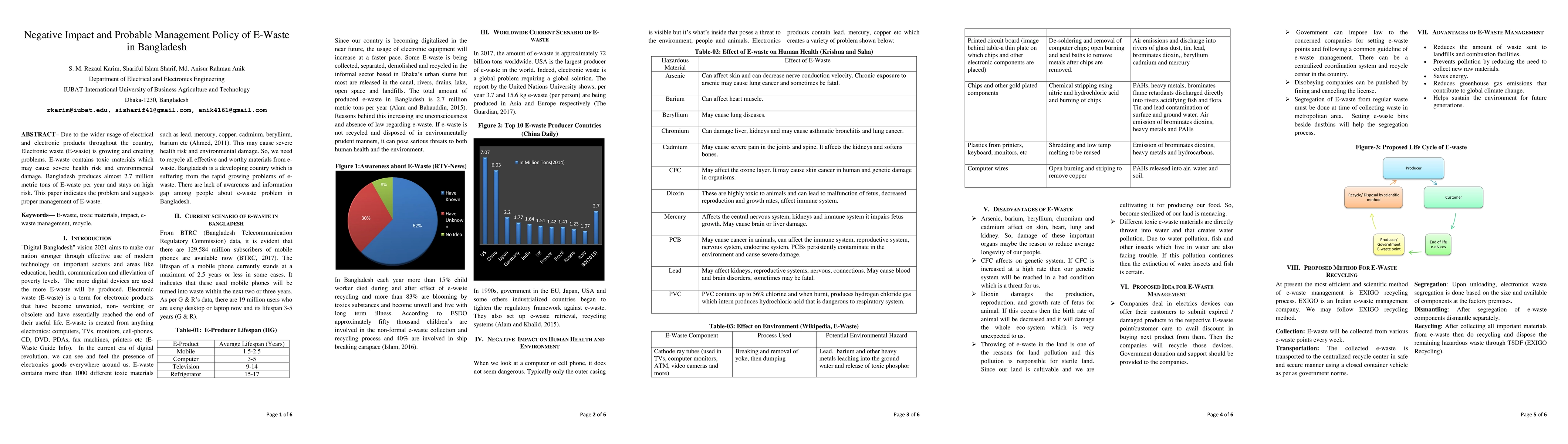 Due to the wider usage of electrical and electronic products throughout the country, Electronic waste (E-waste) is growing and creating problems. E-waste contains toxic materials which may cause severe health risk and environmental damage. Bangladesh produces almost 2.7 million metric tons of E-waste per year and stays on high risk. This paper indicates the problem and suggests proper management of E-waste.