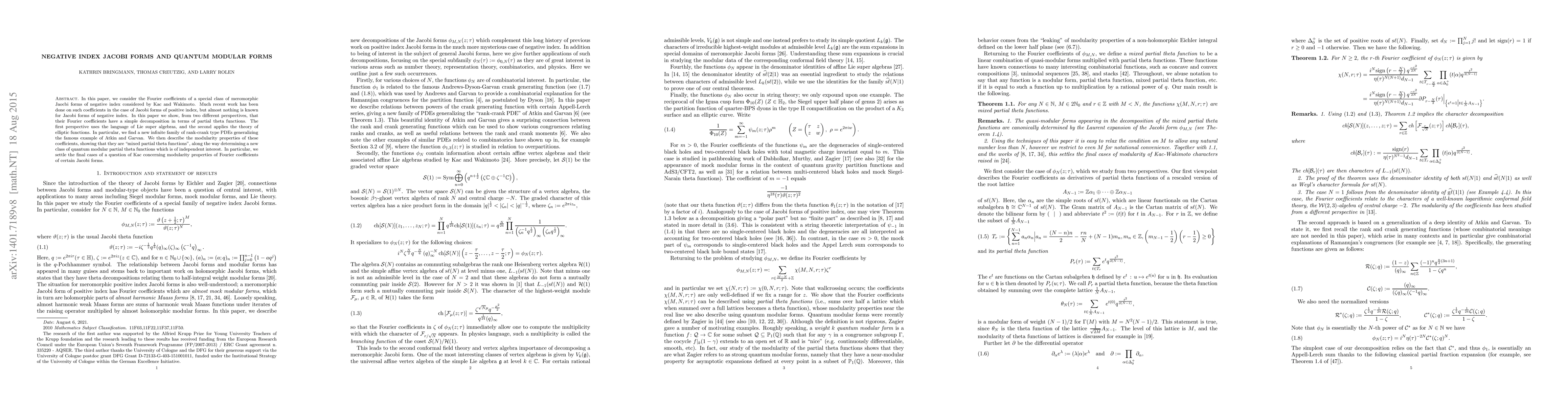 In this paper, we consider the Fourier coefficients of a special class of meromorphic Jaocbi forms of negative index. Much recent work has been done on such coefficients in the case of Jacobi forms of positive index, but almost nothing is known for Jacobi forms of negative index. In this paper we show, from two different perspectives, that their Fourier coefficients have a simple decomposition in terms of partial theta functions. The first perspective uses the language of Lie super algebras, and the second applies the theory of elliptic functions. In particular, we find a new infinite family of rank-crank type PDEs generalizing the famous example of Atkin and Garvan. We then describe the modularity properties of these coefficients, showing that they are "mixed partial theta functions", along the way determining a new class of quantum modular partial theta functions which is of independent interest.
