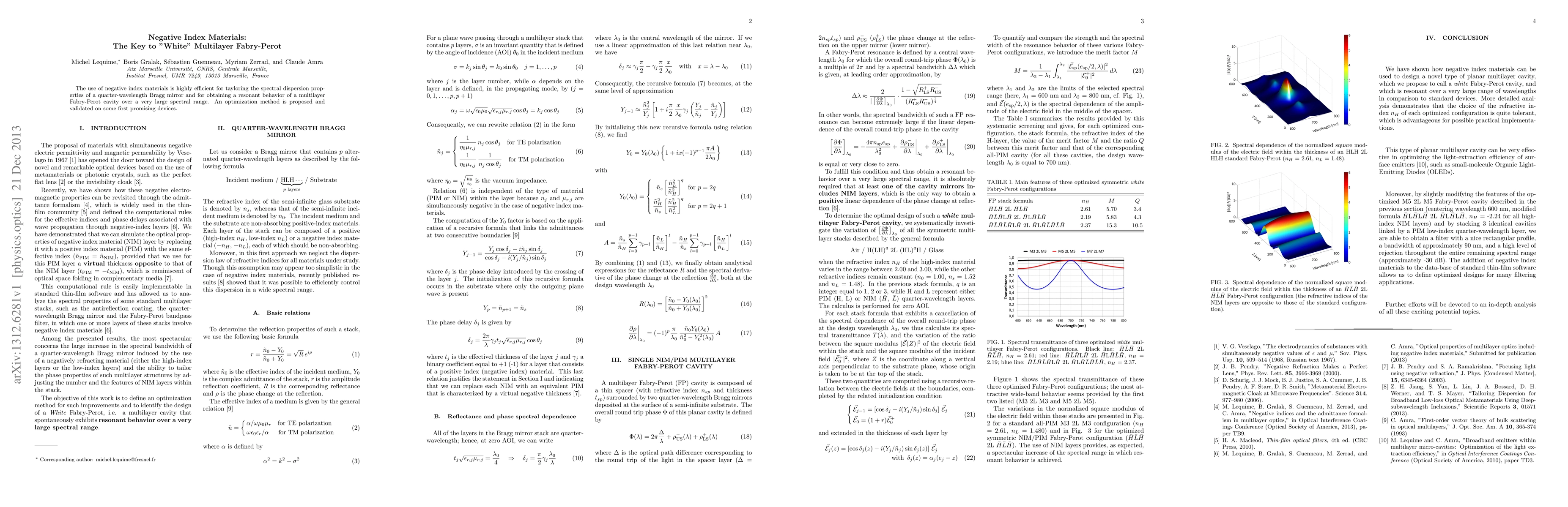 Summary: Negative index materials enhance the spectral dispersion properties of quarter-wavelength Bragg mirrors and optimize multilayer Fabry-Perot cavities for broad spectral ranges; an effective optimization method has been proposed and tested on initial devices.