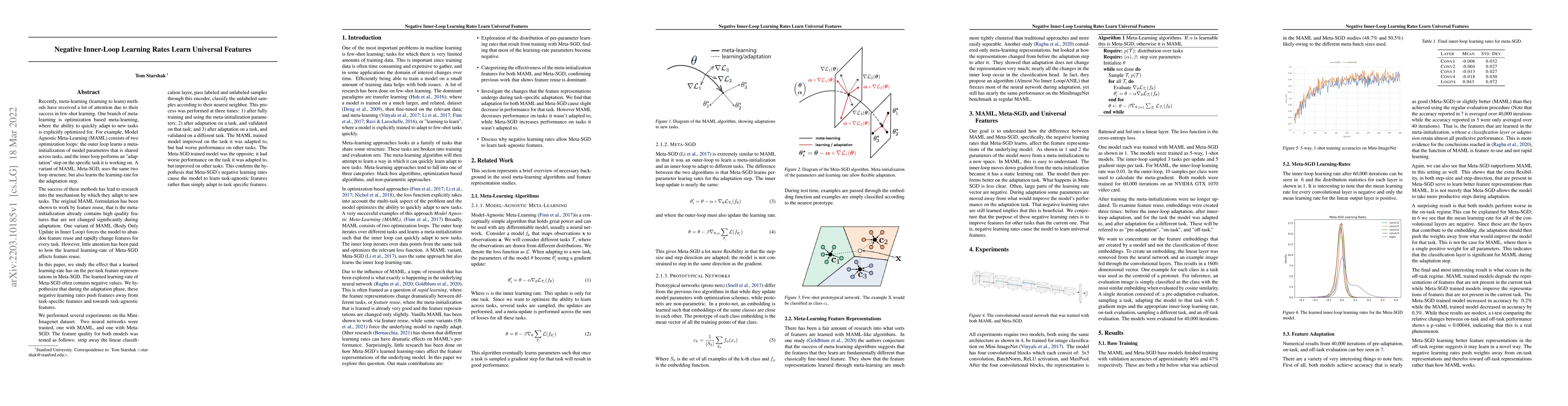 Model Agnostic Meta-Learning (MAML) consists of two optimization loops: the outer loop learns a meta-initialization of model parameters that is shared across tasks, and the inner loop task-specific adaptation step. A variant of MAML, Meta-SGD, uses the same two loop structure, but also learns the learning-rate for the adaptation step. Little attention has been paid to how the learned learning-rate of Meta-SGD affects feature reuse. In this paper, we study the effect that a learned learning-rate has on the per-task feature representations in Meta-SGD. The learned learning-rate of Meta-SGD often contains negative values. During the adaptation phase, these negative learning rates push features away from task-specific features and towards task-agnostic features. We performed several experiments on the Mini-Imagenet dataset. Two neural networks were trained, one with MAML, and one with Meta-SGD. The feature quality for both models was tested as follows: strip away the linear classification layer, pass labeled and unlabeled samples through this encoder, classify the unlabeled samples according to their nearest neighbor. This process was performed: 1) after training and using the meta-initialization parameters; 2) after adaptation, and validated on that task; and 3) after adaptation, and validated on a different task. The MAML trained model improved on the task it was adapted to, but had worse performance on other tasks. The Meta-SGD trained model was the opposite; it had worse performance on the task it was adapted to, but improved on other tasks. This confirms the hypothesis that Meta-SGD's negative learning rates cause the model to learn task-agnostic features rather than simply adapt to task specific features.