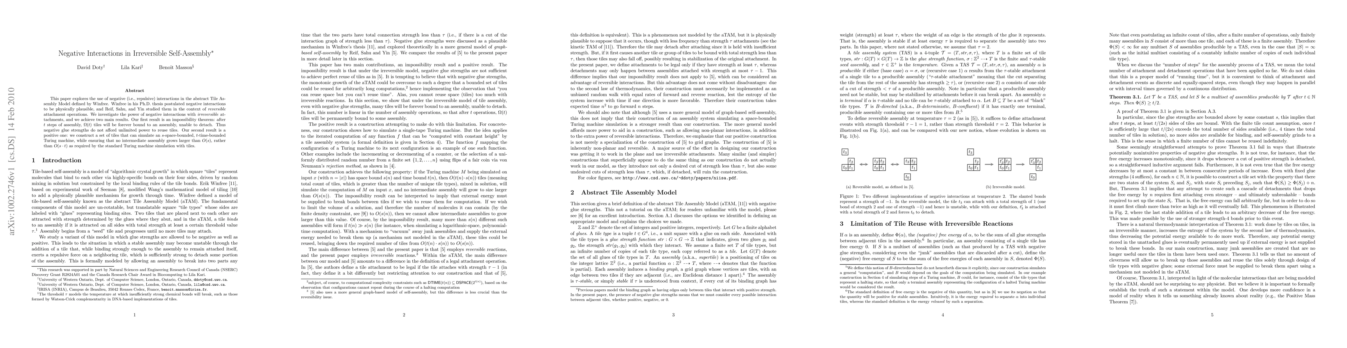 Researchers explore the power of negative interactions in irreversible self-assembly, showing that while they provide unlimited reuse, they also lead to a bound limit to assembly growth, and demonstrate their use for simulating Turing machines.