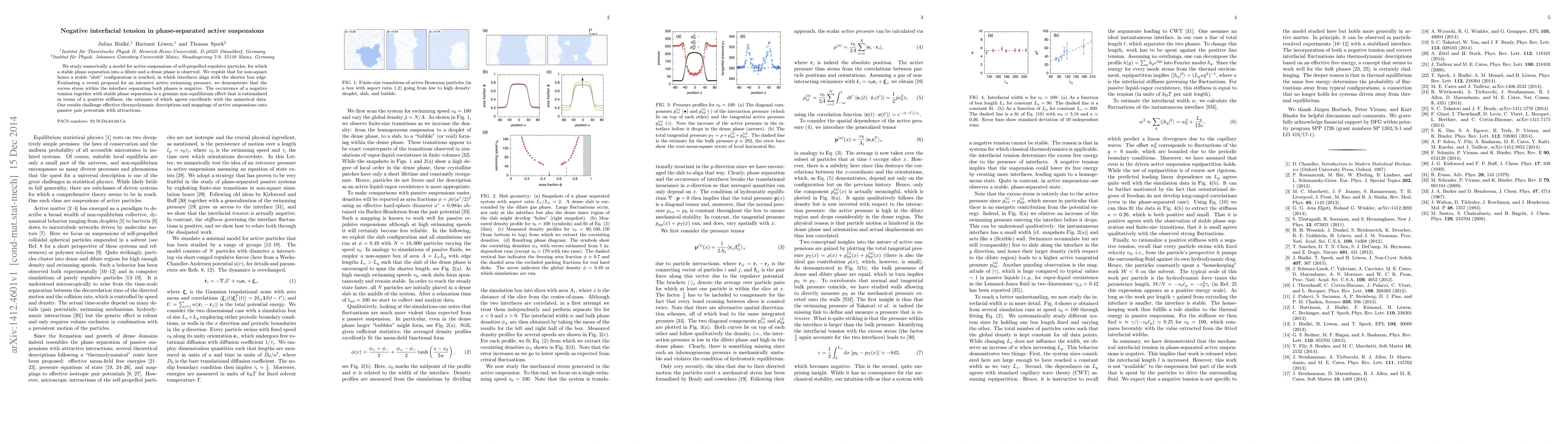 This paper numerically investigates active suspensions of self-propelled particles, revealing stable phase separation and a unique "slab" configuration. It finds that the interface between the dilute and dense phases exhibits negative interfacial tension, a non-equilibrium effect rationalized by positive stiffness, challenging traditional thermodynamic models.