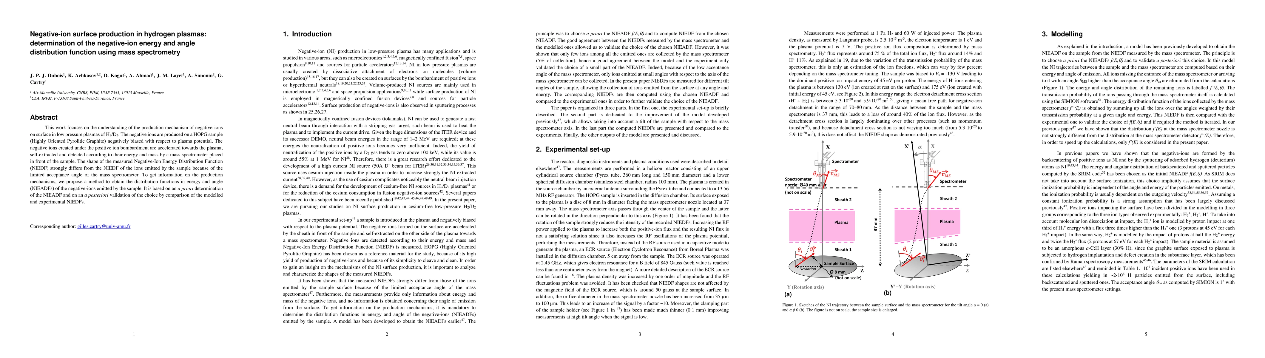 This work focuses on the understanding of the production mechanism of negative-ions on surface in low pressure plasmas of H2/D2. The negative ions are produced on a HOPG sample (Highly Oriented Pyrolitic Graphite) negatively biased with respect to plasma potential. The negative ions created under the positive ion bombardment are accelerated towards the plasma, self-extracted and detected according to their energy and mass by a mass spectrometer placed in front of the sample. The shape of the measured Negative-Ion Energy Distribution Function (NIEDF) strongly differs from the NIEDF of the ions emitted by the sample because of the limited acceptance angle of the mass spectrometer. To get information on the production mechanisms, we propose a method to obtain the distribution functions in energy and angle (NIEADFs) of the negative-ions emitted by the sample. It is based on an a priori determination of the NIEADF and on an a posteriori validation of the choice by comparison of the modelled and experimental NIEDFs.