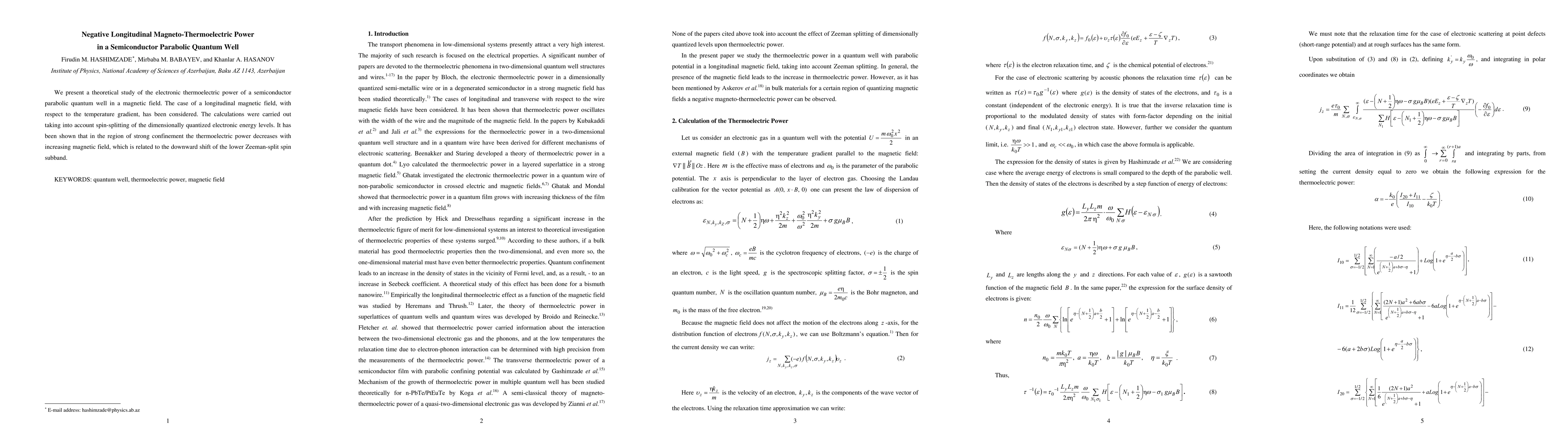 We present a theoretical study of the electronic thermoelectric power of a semiconductor parabolic quantum well in a magnetic field. The case of a longitudinal magnetic field, with respect to the temperature gradient, has been considered. The calculations were carried out taking into account spin-splitting of the dimensionally quantized electronic energy levels. It has been shown that in the region of strong confinement the thermoelectric power decreases with increasing magnetic field, which is related to the downward shift of the lower Zeeman-split spin subband.