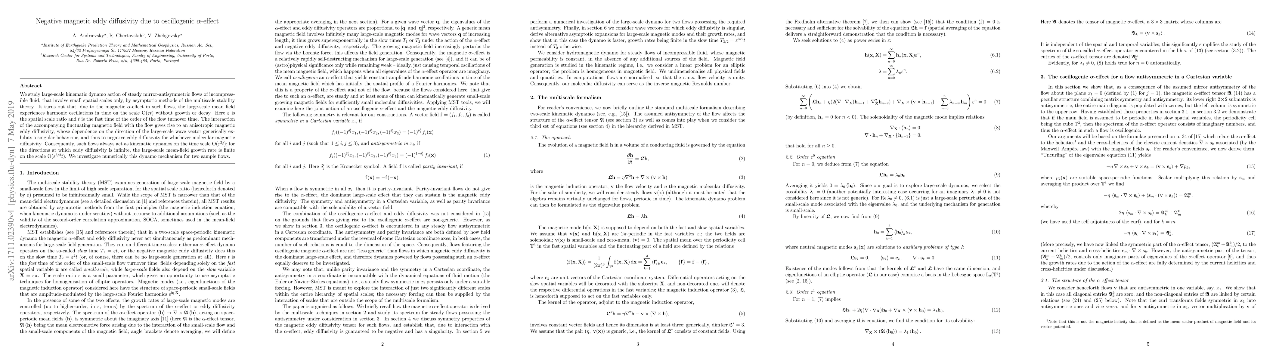 This paper investigates kinematic dynamo action in steady mirror-antisymmetric fluid flows, revealing that the magnetic $\alpha$-effect leads to negative magnetic eddy diffusivity, ensuring the flows act as kinematic dynamos without growth or decay of the large-scale mean field.
