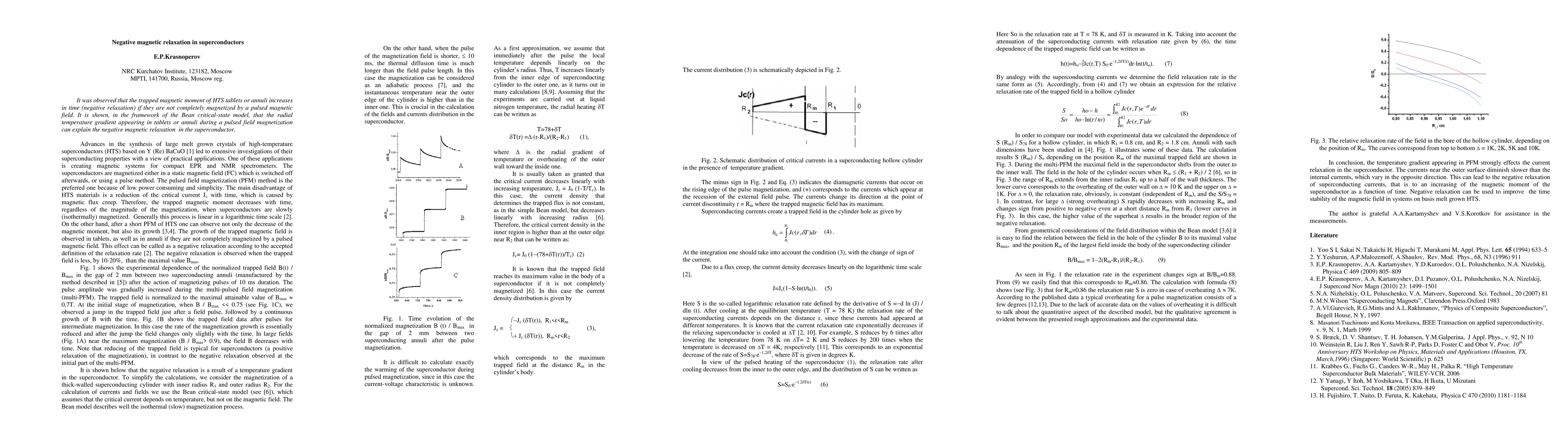 It was observed that the trapped magnetic moment of HTS tablets or annuli increases in time (negative relaxation) if they are not completely magnetized by a pulsed magnetic field. It is shown, in the framework of the Bean critical-state model, that the radial temperature gradient appearing in tablets or annuli during a pulsed field magnetization can explain the negative magnetic relaxation in the superconductor.