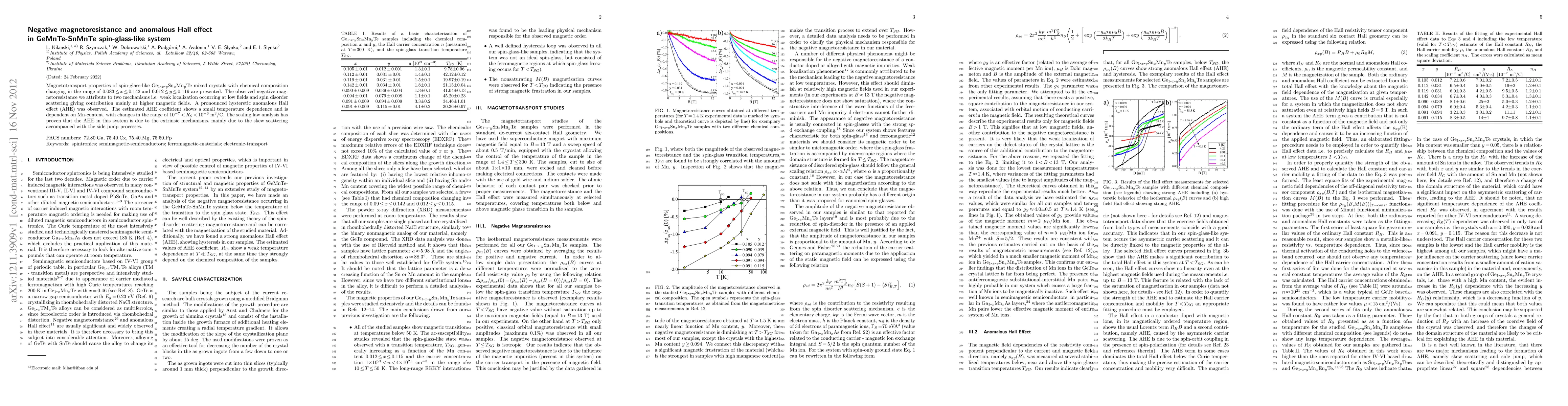 This paper investigates magnetotransport in spin-glass-like Ge/1-x-y/Sn/x/Mn/y/Te crystals, revealing negative magnetoresistance attributed to weak localization and spin disorder scattering. A pronounced hysteretic anomalous Hall effect (AHE) is observed, with its coefficient showing minimal temperature dependence and dependency on Mn content.
