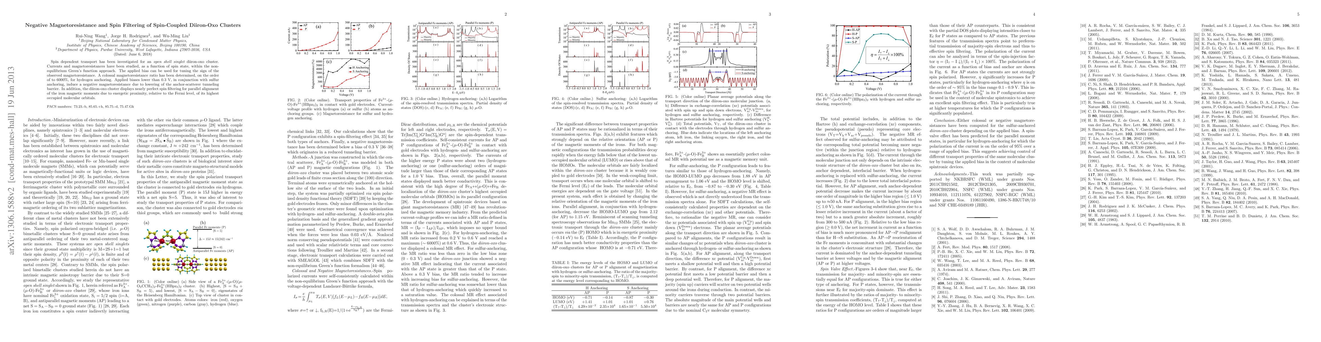 Spin dependent transport has been investigated for an {\it open shell singlet} diiron-oxo cluster. Currents and magnetoresistances have been studied, as a function of spin state, within the non-equilibrium Green's function approach. The applied bias can be used for tuning the sign of the observed magnetoresistance. A colossal magnetoresistance ratio has been determined, on the order of to 6000$%$, for hydrogen anchoring. Applied biases lower than 0.3 V, in conjunction with sulfur anchoring, induce a negative magnetoresistance due to lowering of the anchor-scatterer tunneling barrier. In addition, the diiron-oxo cluster displays nearly perfect spin filtering for parallel alignment of the iron magnetic moments due to energetic proximity, relative to the Fermi level, of its highest occupied molecular orbitals.