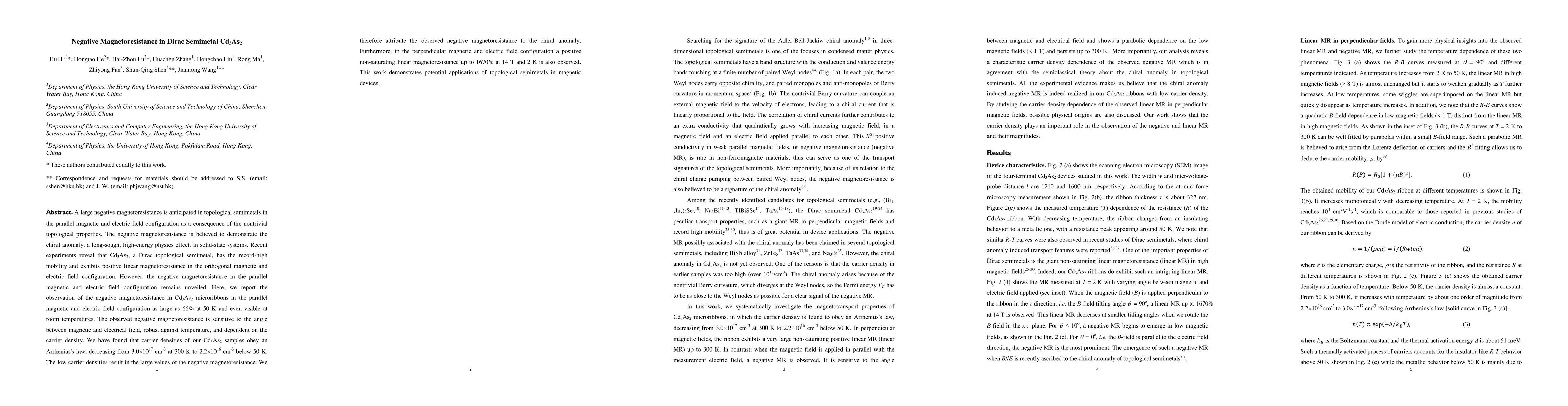 The study reports the observation of large negative magnetoresistance (up to 66% at 50 K) in Cd3As2 microribbons under parallel magnetic and electric fields, attributing this phenomenon to the chiral anomaly due to low carrier densities. Additionally, it reveals positive linear magnetoresistance in perpendicular configurations, showcasing potential for magnetic devices.