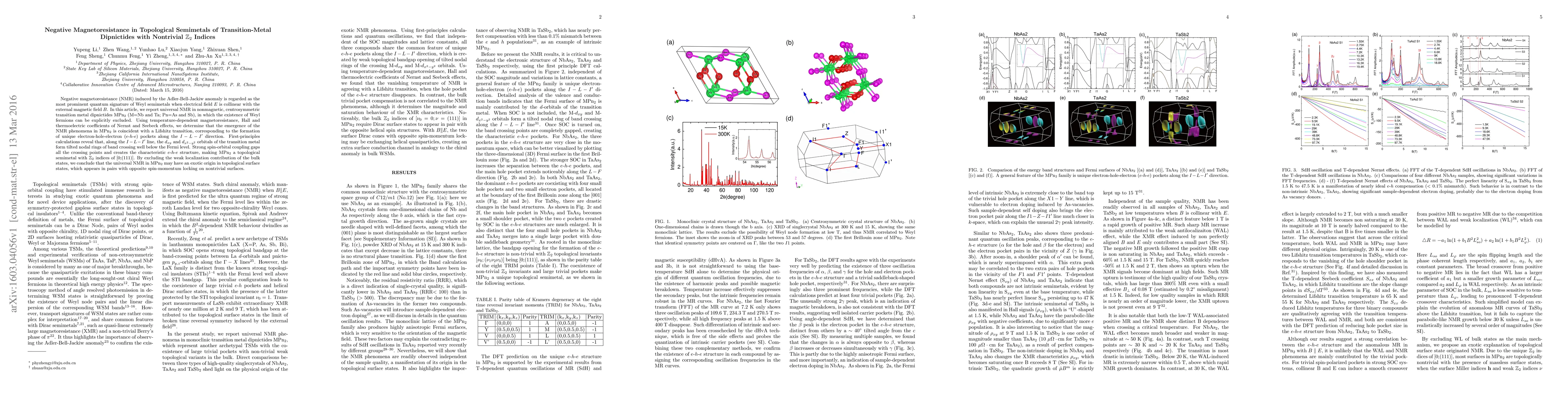This paper reports universal negative magnetoresistance in nonmagnetic transition metal dipnictides MPn₂, despite the absence of Weyl fermions. The NMR is linked to a Lifshitz transition forming unique electron-hole-electron pockets, and first-principles calculations suggest the presence of topological surface states with nontrivial Z₂ indices.