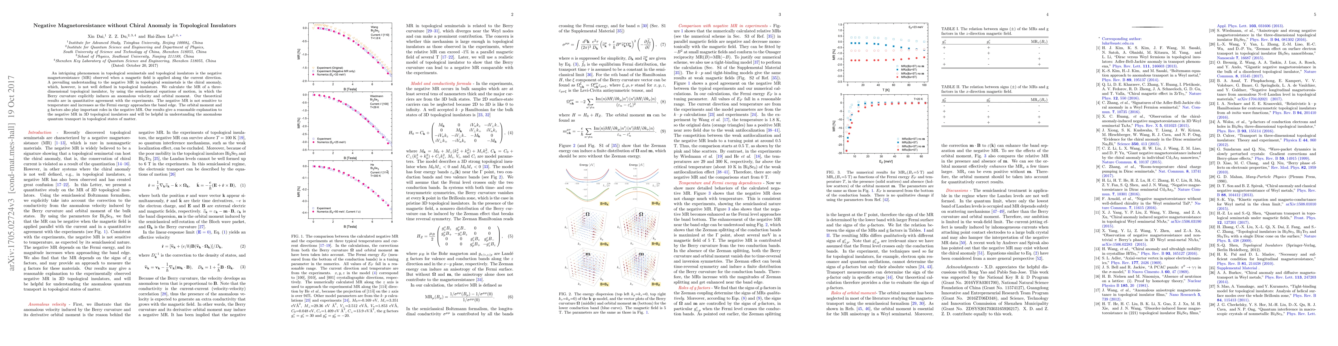 This paper investigates negative magnetoresistance (MR) in three-dimensional topological insulators, finding that it occurs without reliance on the chiral anomaly, unlike in topological semimetals. Theoretical calculations using semiclassical equations of motion show that the Berry curvature induces an anomalous velocity and orbital moment, providing a quantitative explanation for the observed MR, which is temperature-insensitive and increases near the band edge.
