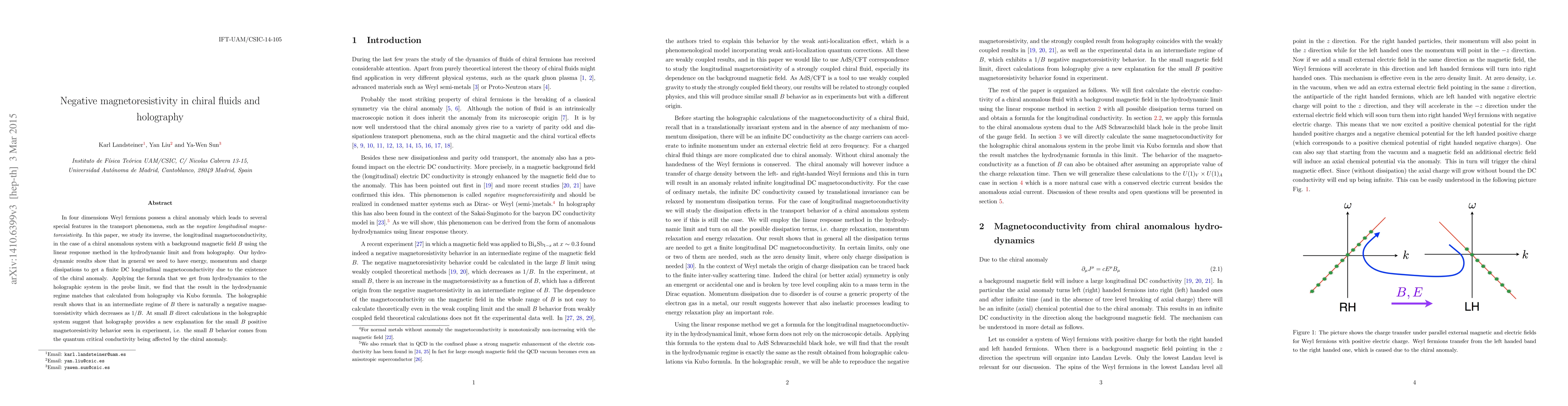 Researchers studied negative magnetoresistivity in chiral fluids and found that a background magnetic field can lead to naturally occurring negative longitudinal magnetoconductivity in an intermediate regime of B, which matches results from hydrodynamics and holography.