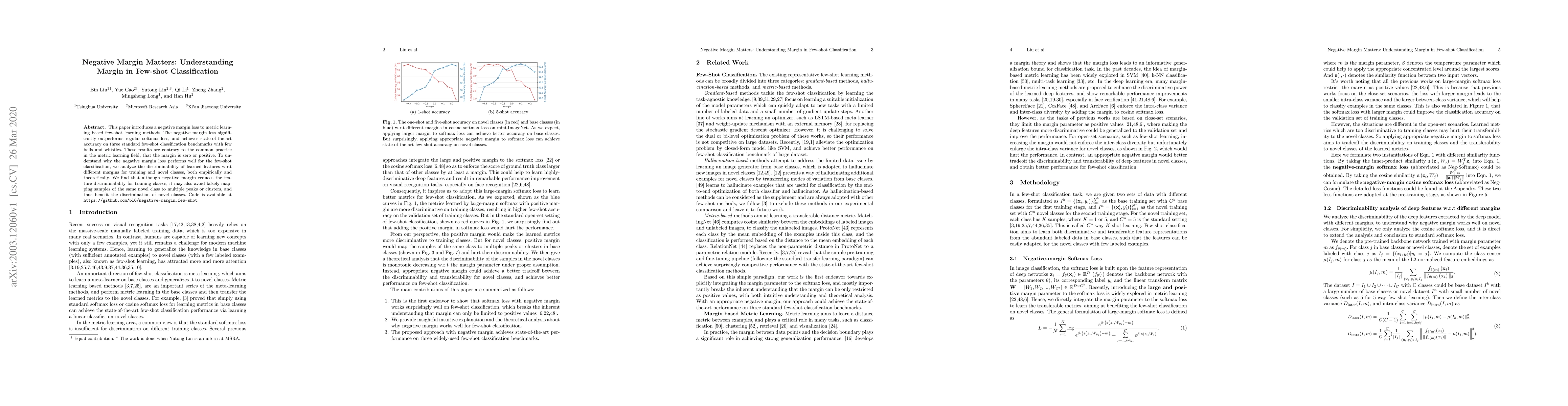 This paper proposes a negative margin loss for metric learning in few-shot classification, achieving better accuracy than regular softmax loss. The analysis reveals that while negative margins reduce discriminability for training classes, they help prevent novel class samples from clustering incorrectly, thus enhancing overall performance.