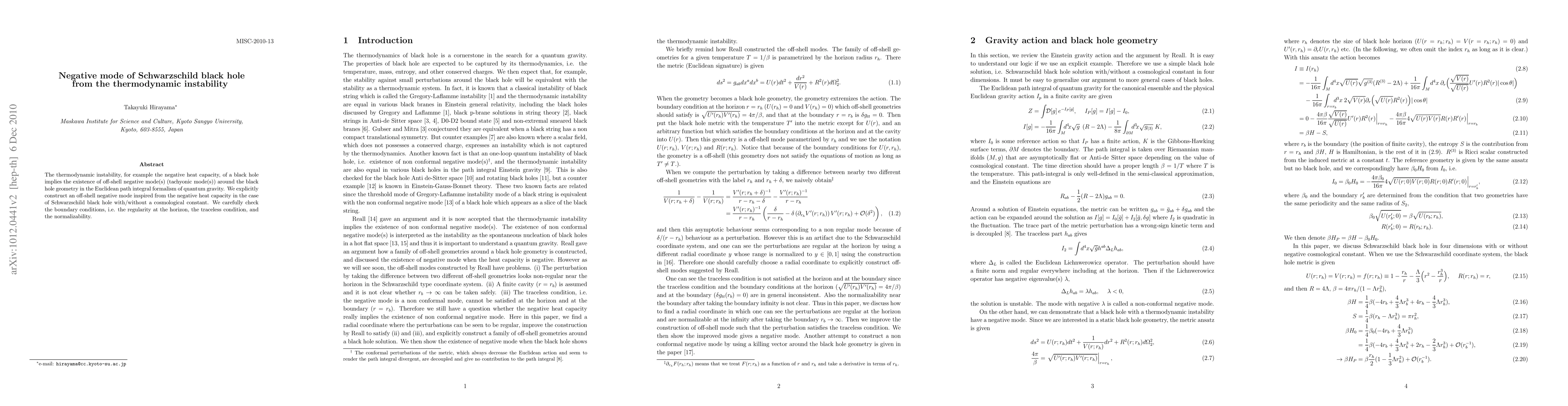 The thermodynamic instability, for example the negative heat capacity, of a black hole implies the existence of off-shell negative mode(s) (tachyonic mode(s)) around the black hole geometry in the Euclidean path integral formalism of quantum gravity. We explicitly construct an off-shell negative mode inspired from the negative heat capacity in the case of Schwarzschild black hole with/without a cosmological constant. We carefully check the boundary conditions, i.e. the regularity at the horizon, the traceless condition, and the normalizability.