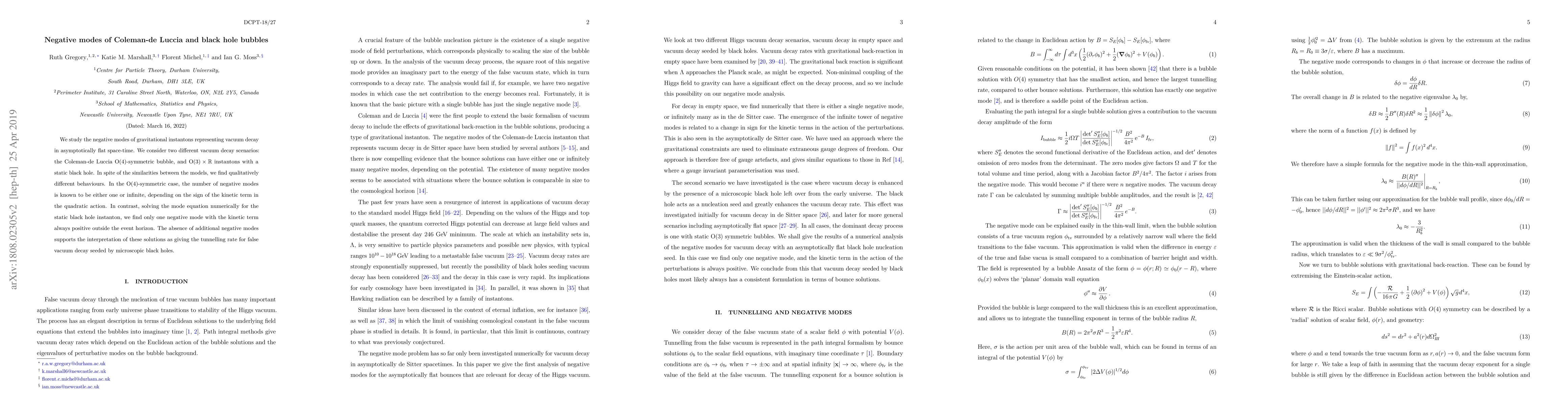 We study the negative modes of gravitational instantons representing vacuum decay in asymptotically flat space-time. We consider two different vacuum decay scenarios: the Coleman-de Luccia $\mathrm{O}(4)$-symmetric bubble, and $\mathrm{O}(3) \times \mathbb{R}$ instantons with a static black hole. In spite of the similarities between the models, we find qualitatively different behaviours. In the $\mathrm{O}(4)$-symmetric case, the number of negative modes is known to be either one or infinite, depending on the sign of the kinetic term in the quadratic action. In contrast, solving the mode equation numerically for the static black hole instanton, we find only one negative mode with the kinetic term always positive outside the event horizon. The absence of additional negative modes supports the interpretation of these solutions as giving the tunnelling rate for false vacuum decay seeded by microscopic black holes.