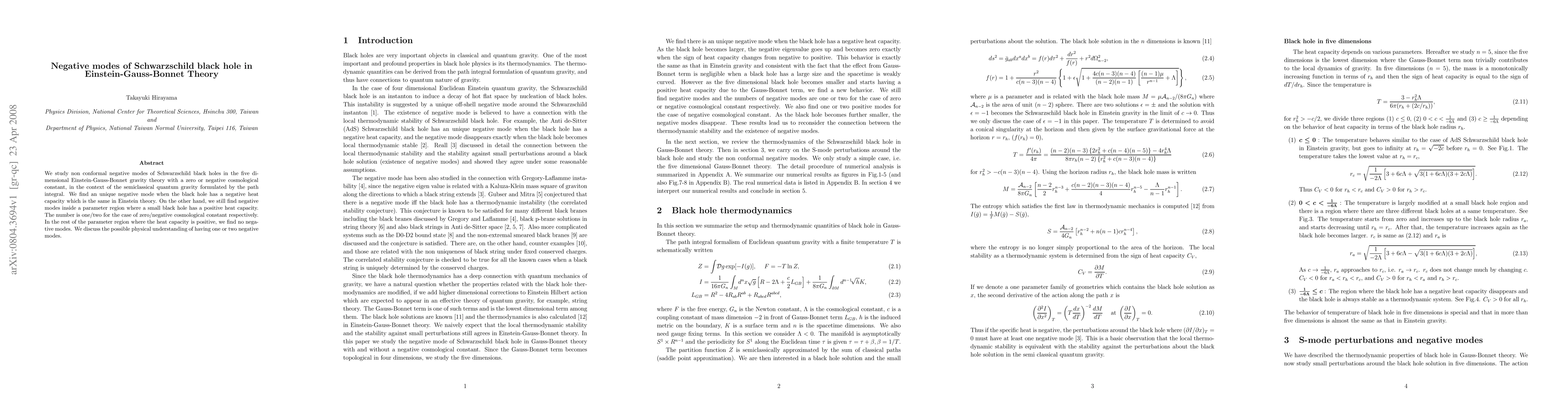 This paper investigates non-conformal negative modes in Schwarzschild black holes within the five-dimensional Einstein-Gauss-Bonnet gravity theory, revealing a unique negative mode when the black hole has a negative heat capacity, similar to Einstein theory. It also finds one or two negative modes in regions where small black holes have a positive heat capacity, depending on the cosmological constant.