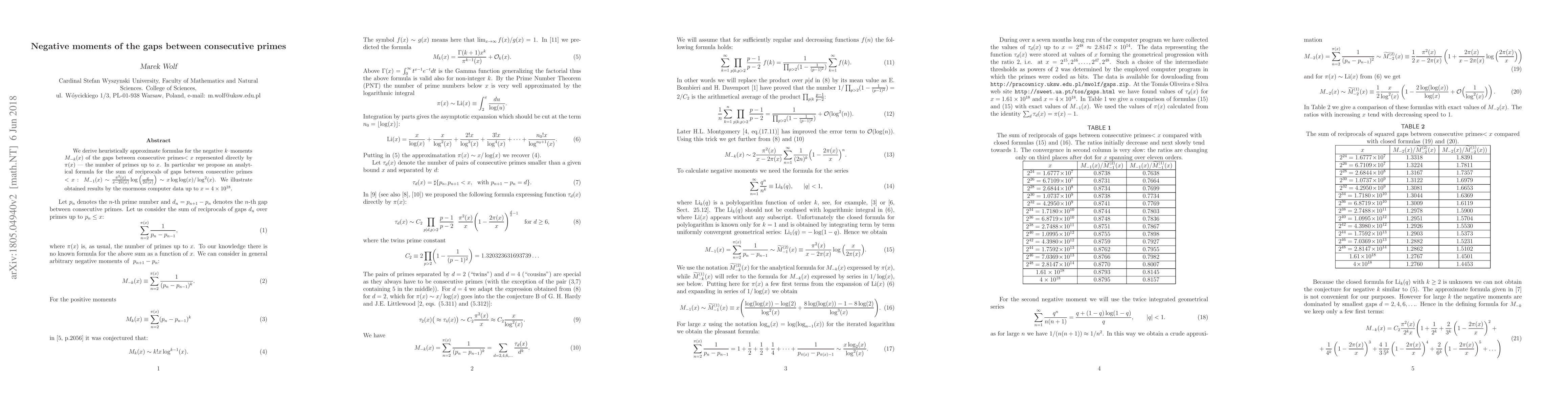 This paper provides heuristic formulas for the negative $k$-moments of prime gaps, specifically proposing an analytical formula for the sum of reciprocals of gaps between consecutive primes less than $x$. The derived formula is $M_{-1}(x) \sim x \log \log(x)/\log^2(x)$, which is validated using extensive computational data up to $x=4\times 10^{18}$.